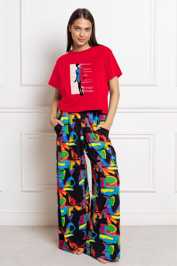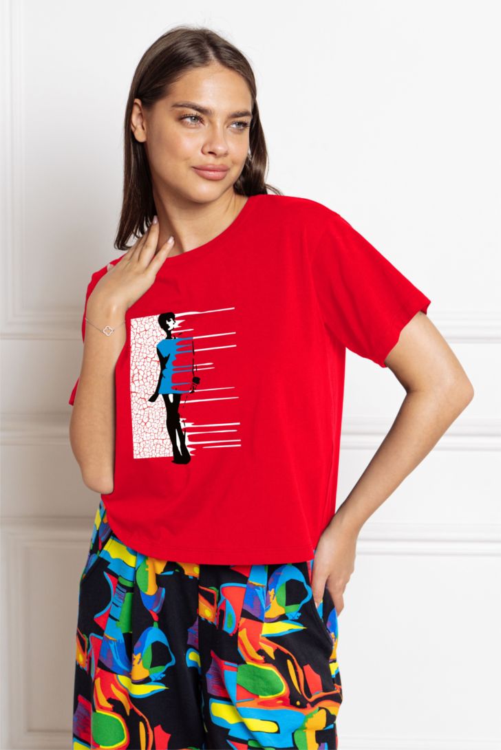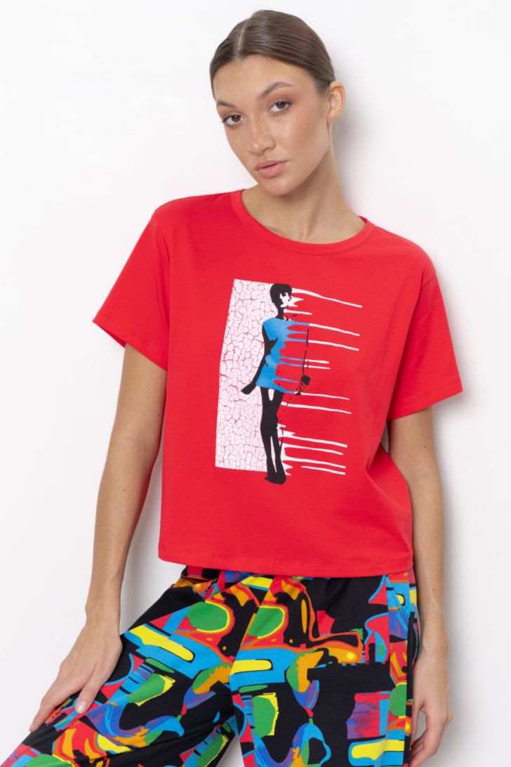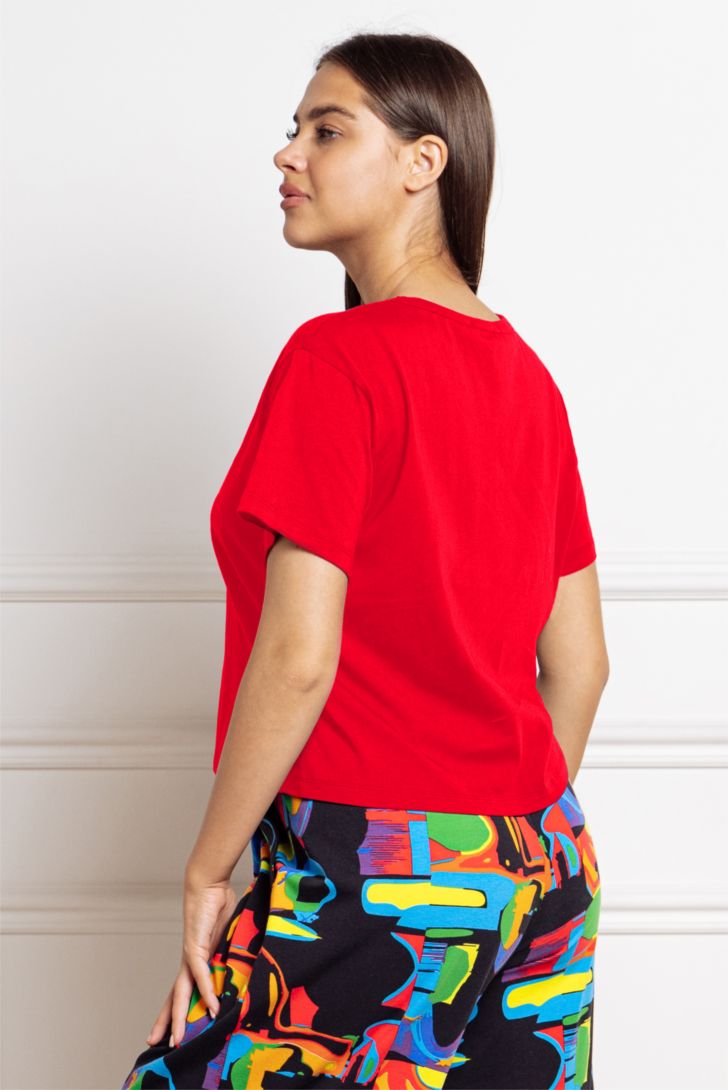 "Футболка укороченная с коротким рукавом и спущенной линией плеча. Вырез горловины круглый. Модель декорирована тематическим принтом.