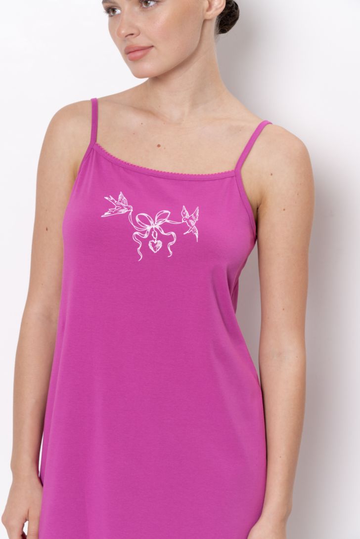 Сорочка на тонких регулируемых бретелях. Лиф сорочки декорирован контрастной строчкой «мережка». Модель представлена в 4-х цветовых решениях.