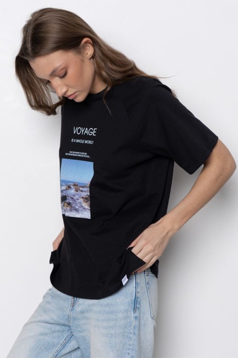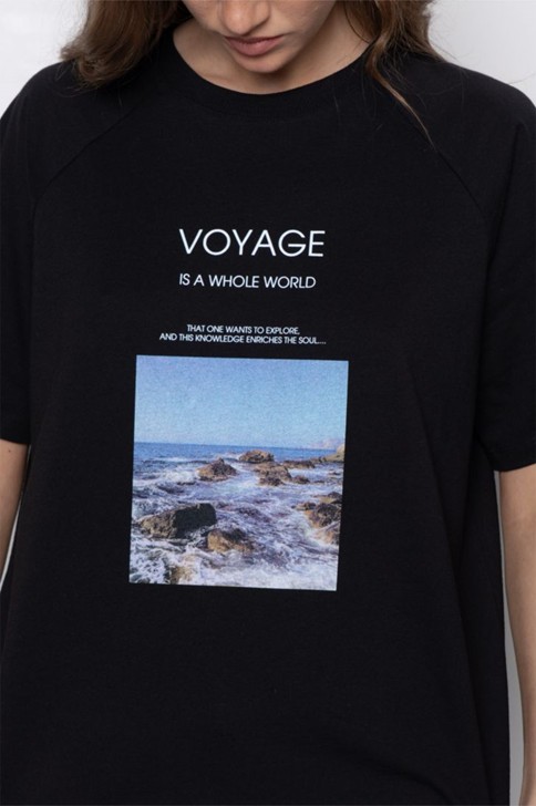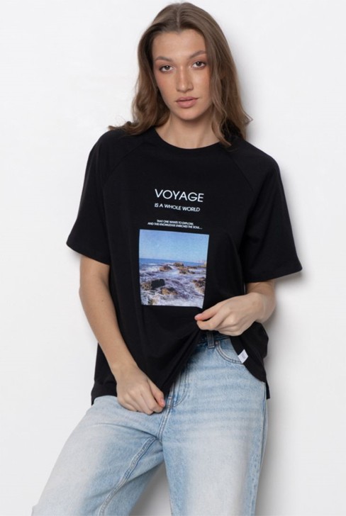 Футболка свободного прилегания с рукавом реглан. Вырез горловины круглый.