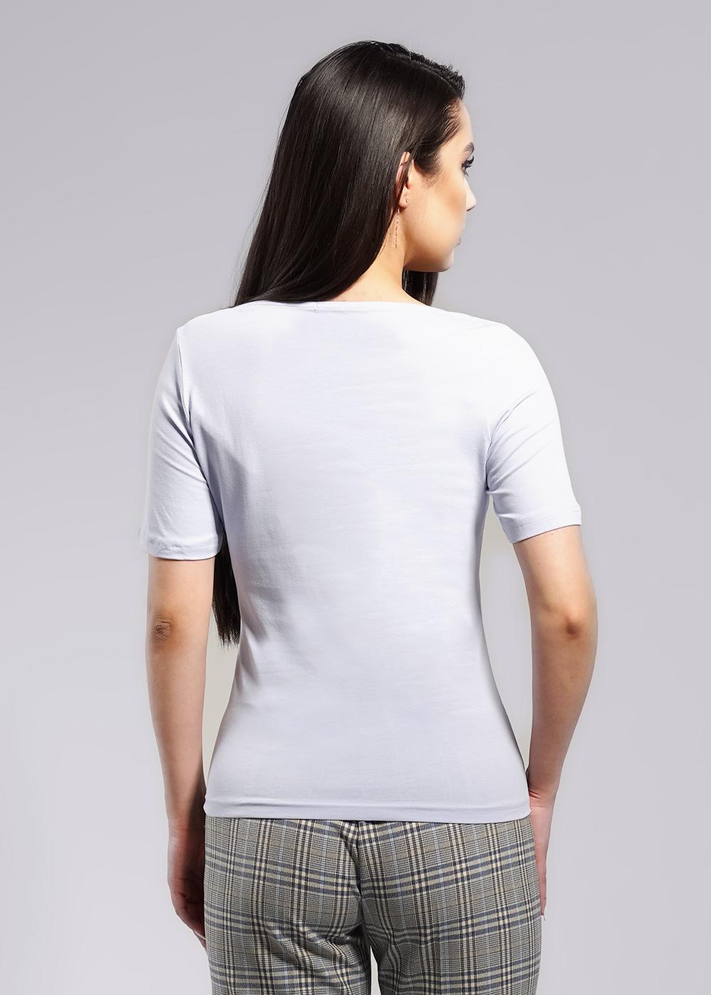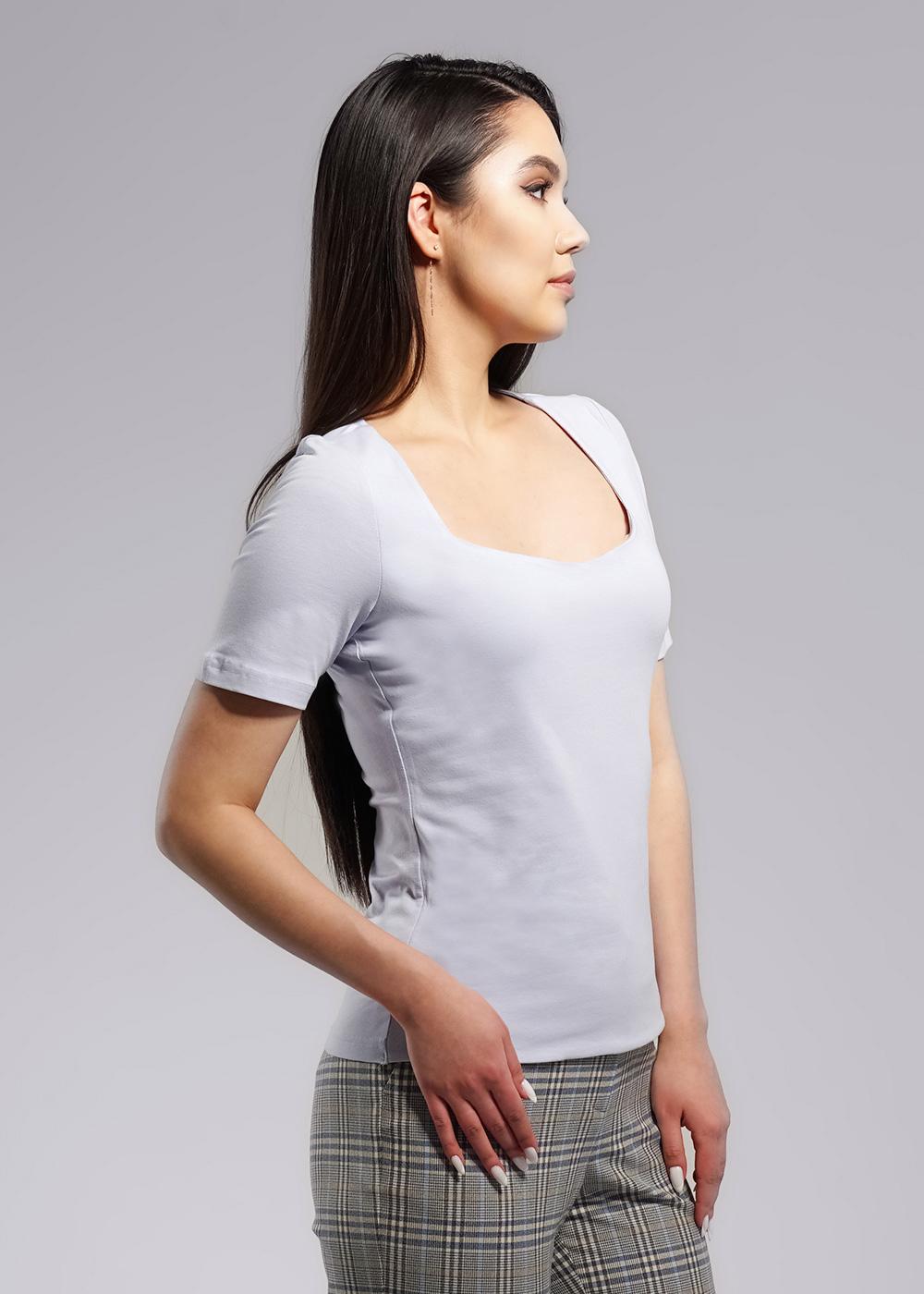 Джемпер из трикотажного полотна с эластаном- кулирная гладь. Втачной короткий рукав. Двойной перед. Фигурный вырез горловины.