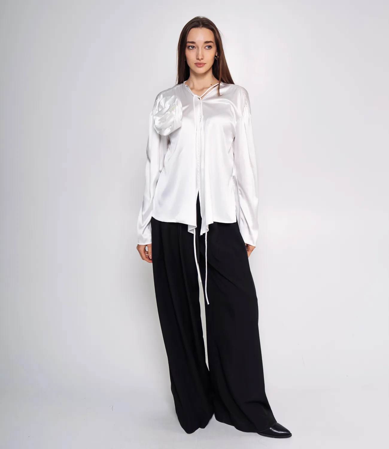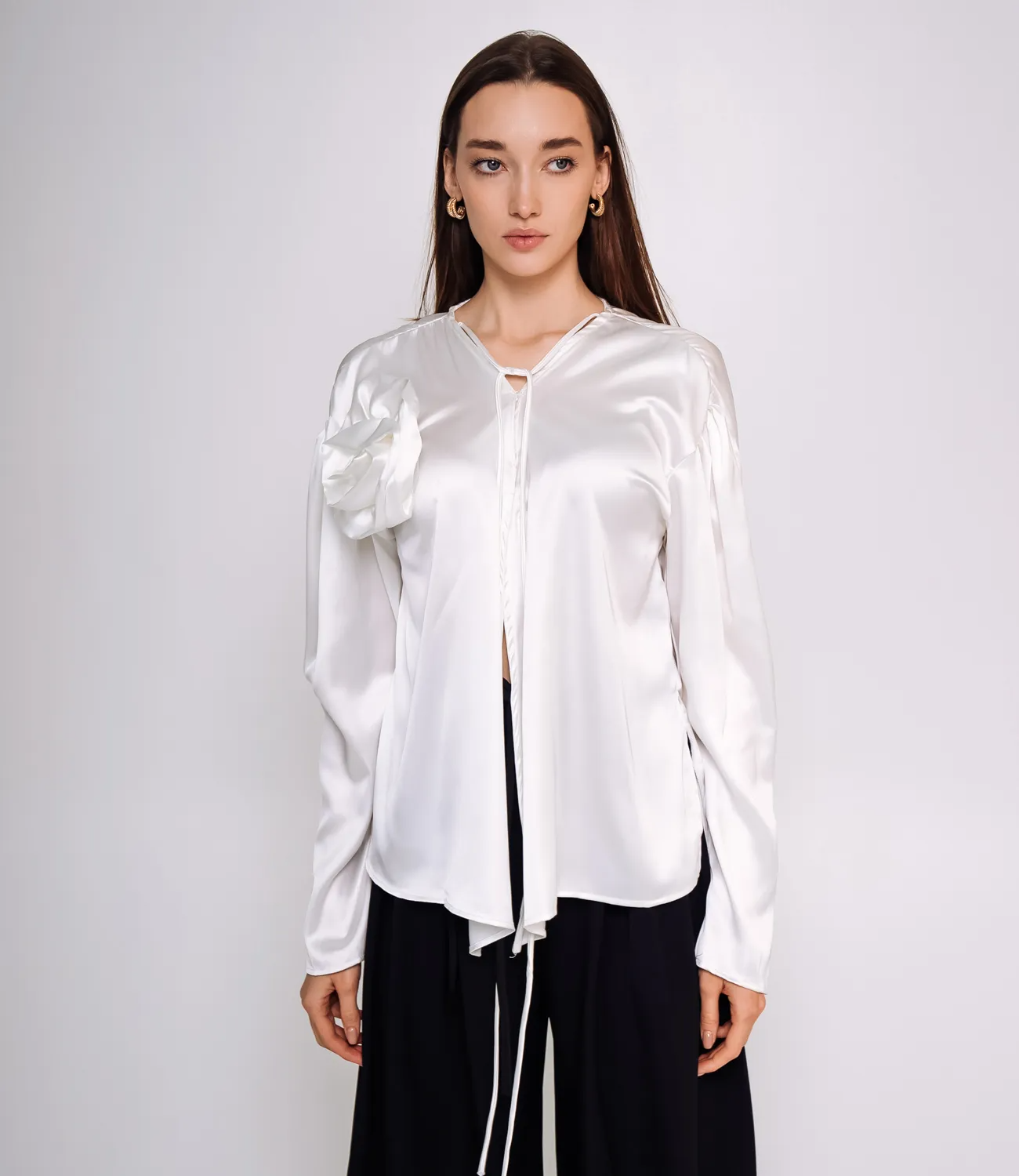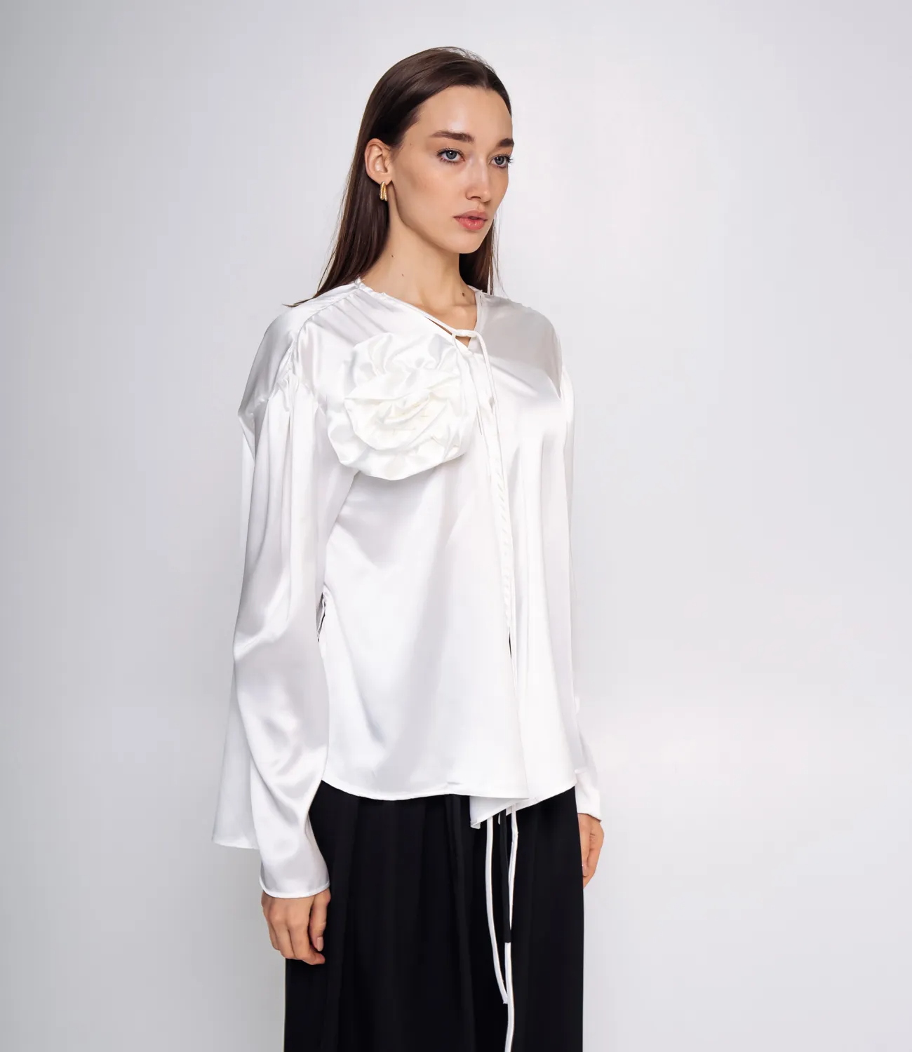 Яркая блуза для вечерних встреч или работы. Атласная ткань и элемент в виде розы сделают ваш образ романтичным. Рост модели: 168, параметры: 85-63-92.