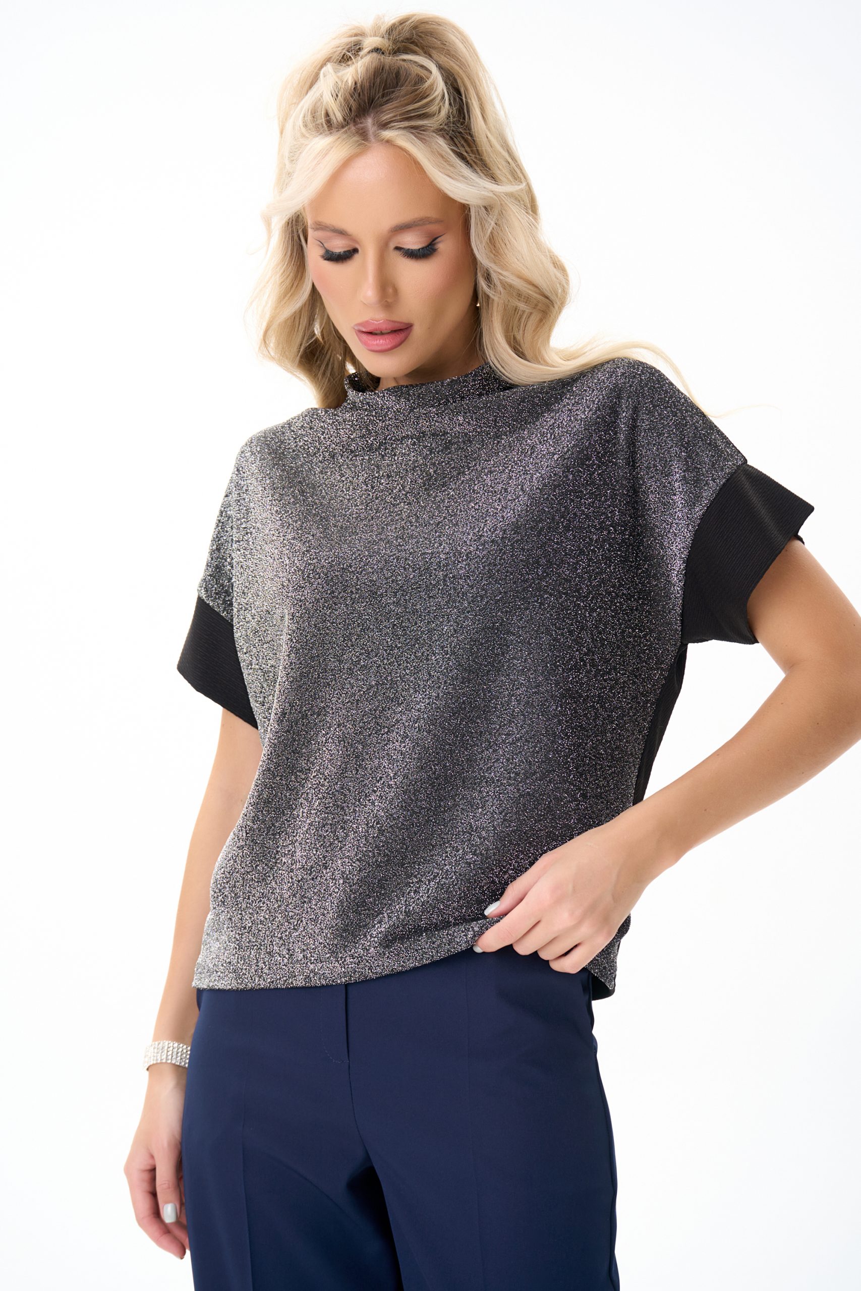 Туника «Лючия» — универсальная модель, выполненная из мягкого эластичного полотна с эффектным мерцающим покрытием. Лёгкий блеск ткани делает образ выразительным, но при этом остаётся в рамках сдержанной элегантности. Свободный силуэт комфортно садится по фигуре, не стесняя движений и визуально корректируя линию плеч. Укороченный рукав дарит аккуратный и женственный акцент, а мягкая драпировка в области горловины создаёт более утончённый вид. Туника сочетается с брюками, юбками и базовыми вещами, подойдёт и для повседневных образов, и для вечерних выходов. Лёгкая, универсальная и всегда уместная — модель, которая смотрится стильно без усилий.