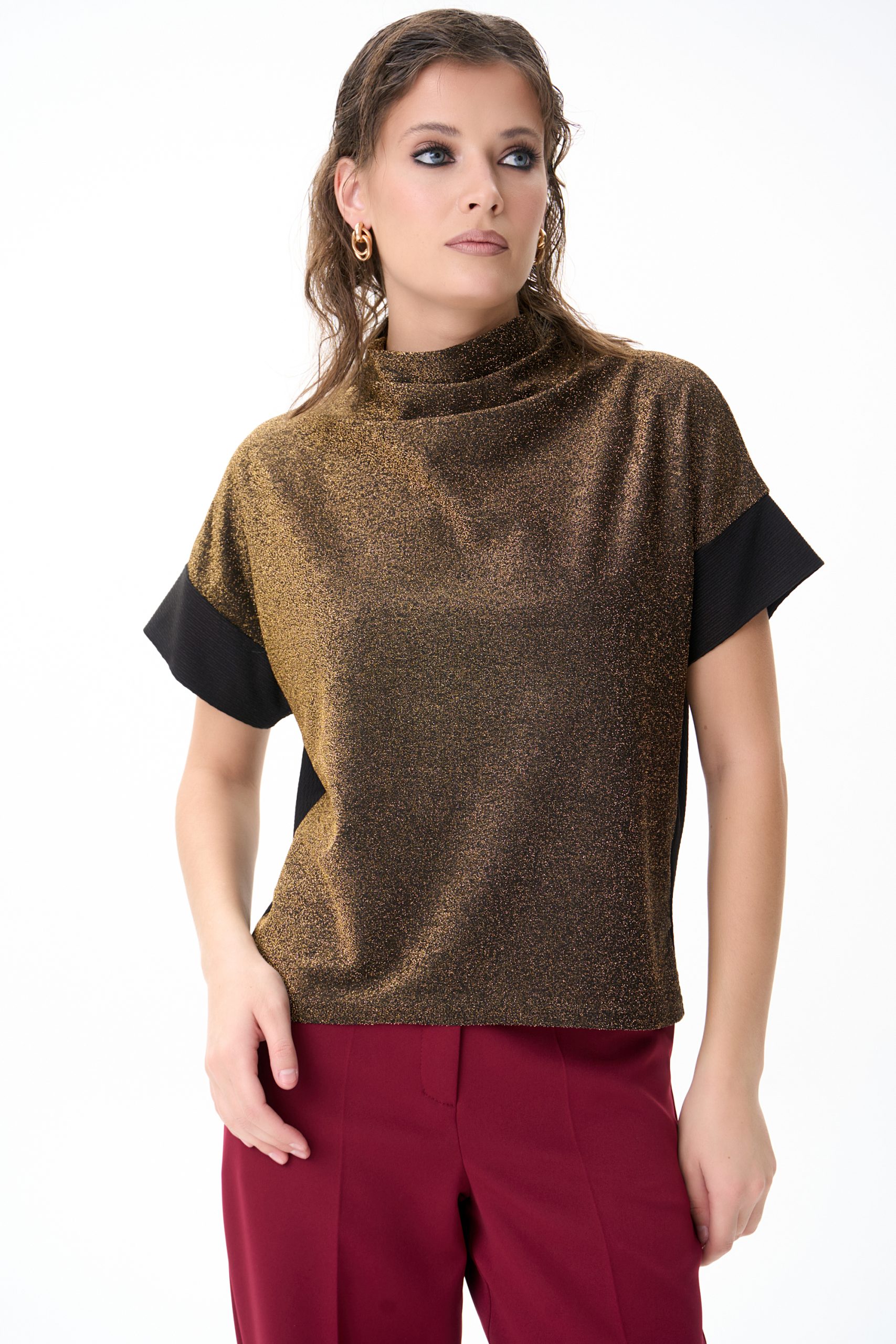 Туника «Лючия» — универсальная модель, выполненная из мягкого эластичного полотна с эффектным мерцающим покрытием. Лёгкий блеск ткани делает образ выразительным, но при этом остаётся в рамках сдержанной элегантности. Свободный силуэт комфортно садится по фигуре, не стесняя движений и визуально корректируя линию плеч. Укороченный рукав дарит аккуратный и женственный акцент, а мягкая драпировка в области горловины создаёт более утончённый вид. Туника сочетается с брюками, юбками и базовыми вещами, подойдёт и для повседневных образов, и для вечерних выходов. Лёгкая, универсальная и всегда уместная — модель, которая смотрится стильно без усилий.