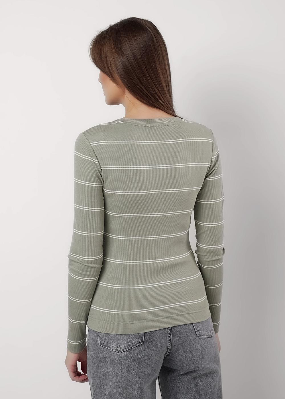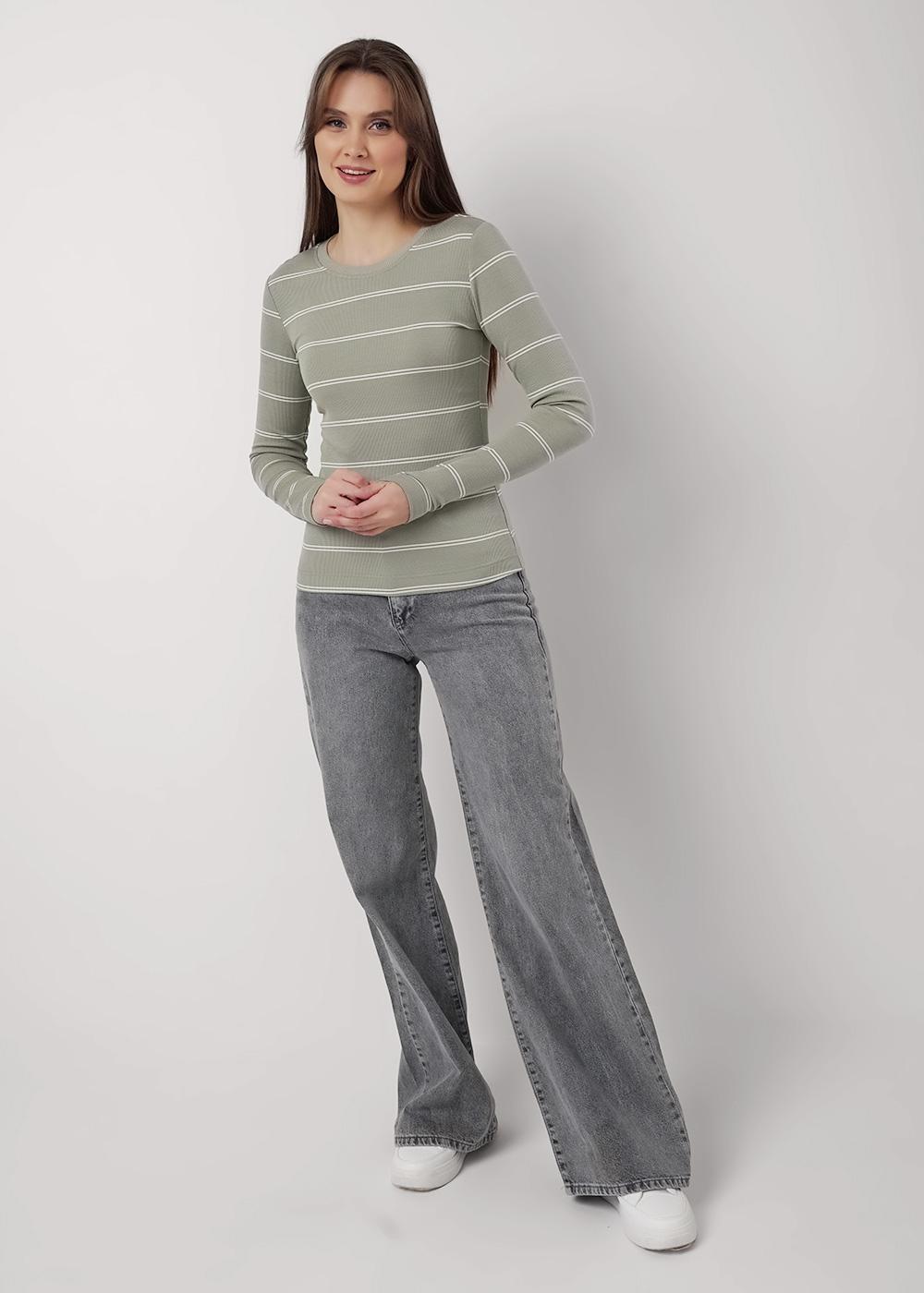 Фуфайка из эластичного трикотажного полотна кошкорсе в полоску. Округлая горловина с обтачкой. Длинный втачной рукав.