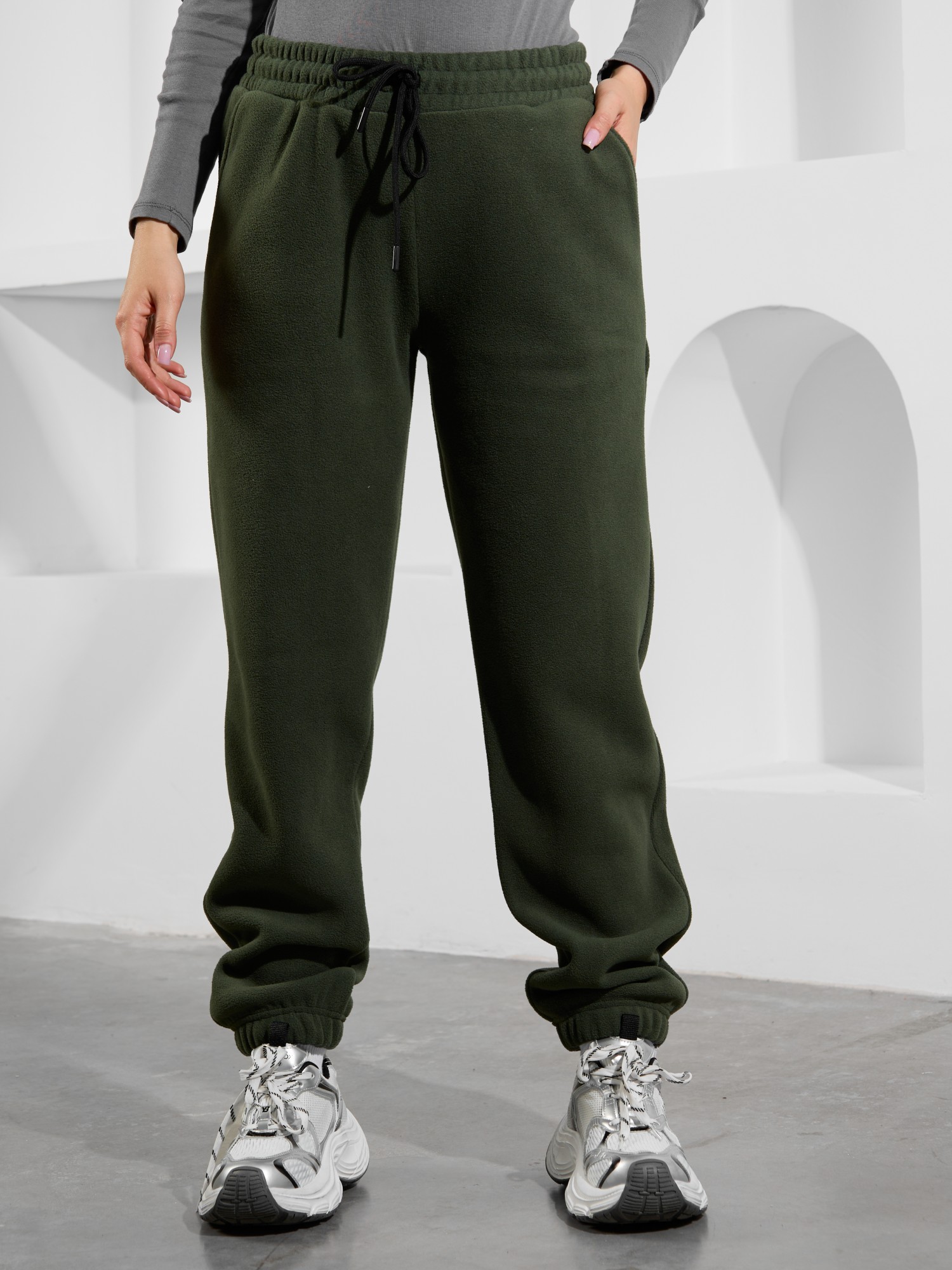 Брюки молодежные из трикотажного гладкокрашенного полотна «флис», длинные, на притачном поясе с эластичной тесьмой внутри и шнурком, продетым через две петли в центре пояса, с карманами в боковых швах и эластичной тесьмой по низу.