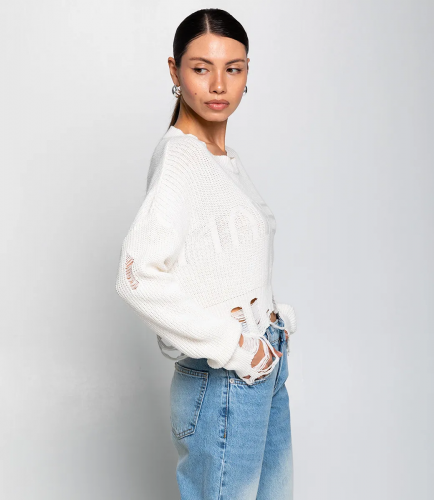 Джемпер – это одежда, которая подчеркивает привлекательность каждой представительницы прекрасного пола. Укороченный джемпер с рваностями и надписью отлично подойдет для демисезонного сезона. Его выбирают покупательницы, которые ценят сочетание качества и эксклюзивности. Фасон подчеркивает изящность фигуры. Производитель знает, как разработать стильные и модные решения. Для пошива использован материал из 50% хлопка, 50% хлопка, который характеризуется отличным качеством. Даже после большого количества стирок изделие не утратит первоначальной красоты. Вы обязательно будете носить его с радостью. Обратите внимание на рваности, которые придают джемперу особый шарм и делают его еще более выразительным. Чтобы вы были уверены в размере, мы представили на странице таблицу. Воспользовавшись ею, вы сможете самостоятельно обмерить себя и удостовериться. Установленная нами цена является приемлемой. Не откажите себе в удовольствии быть неповторимой! Рост модели 164 см., 83-61-89.