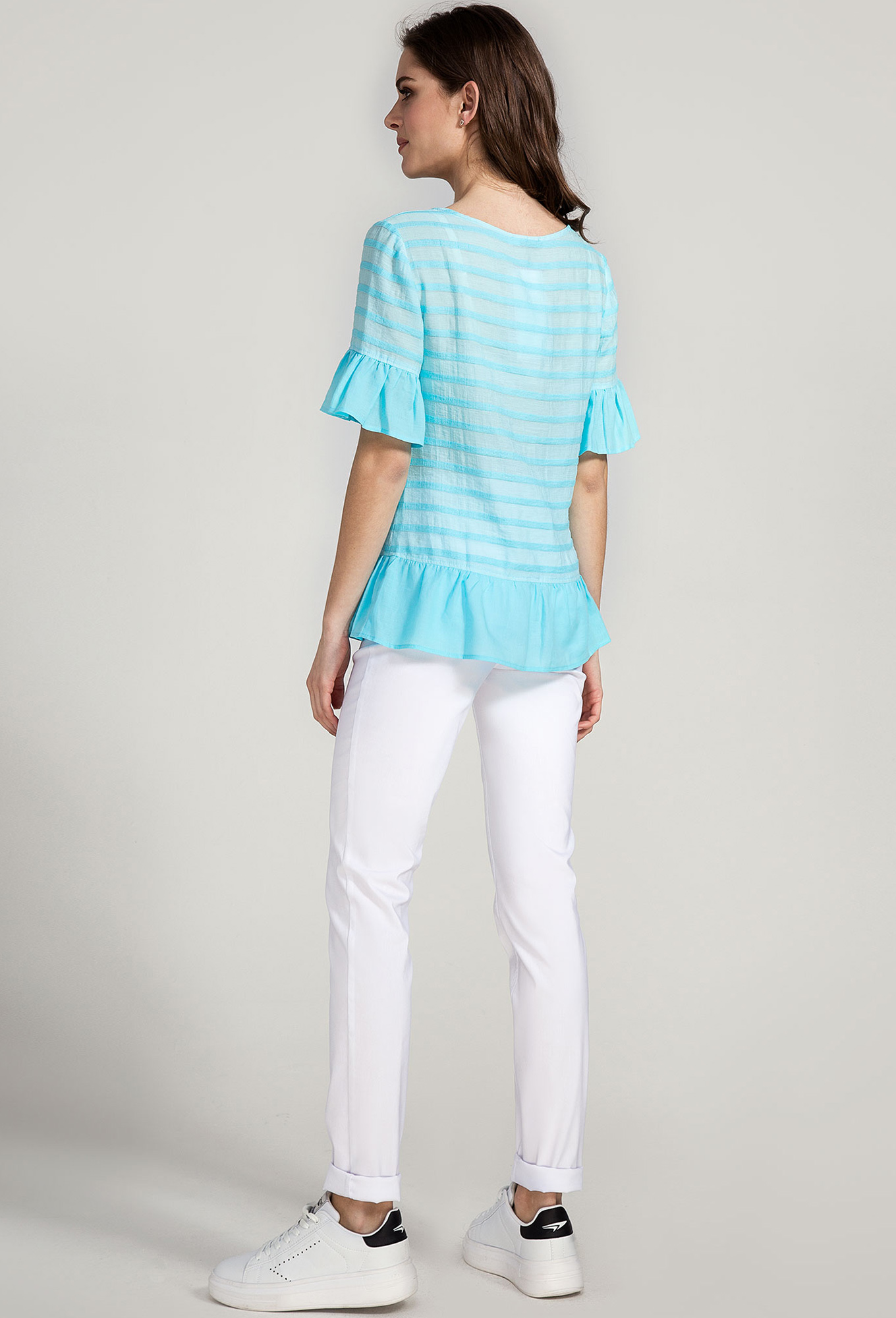 Стильная блузка из вискозной ткани. Блуза прямого силуэта по линии низа притачной волан, с круглым вырезом горловины. Спинка прямого силуэта с притачным воланом. Рукава короткие втачные с воланом.