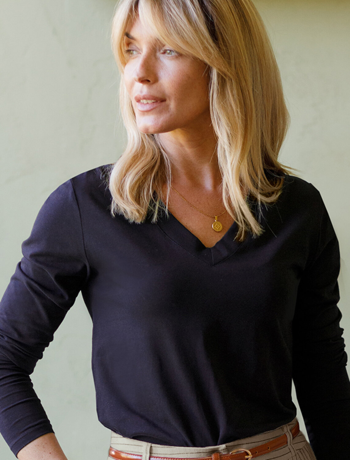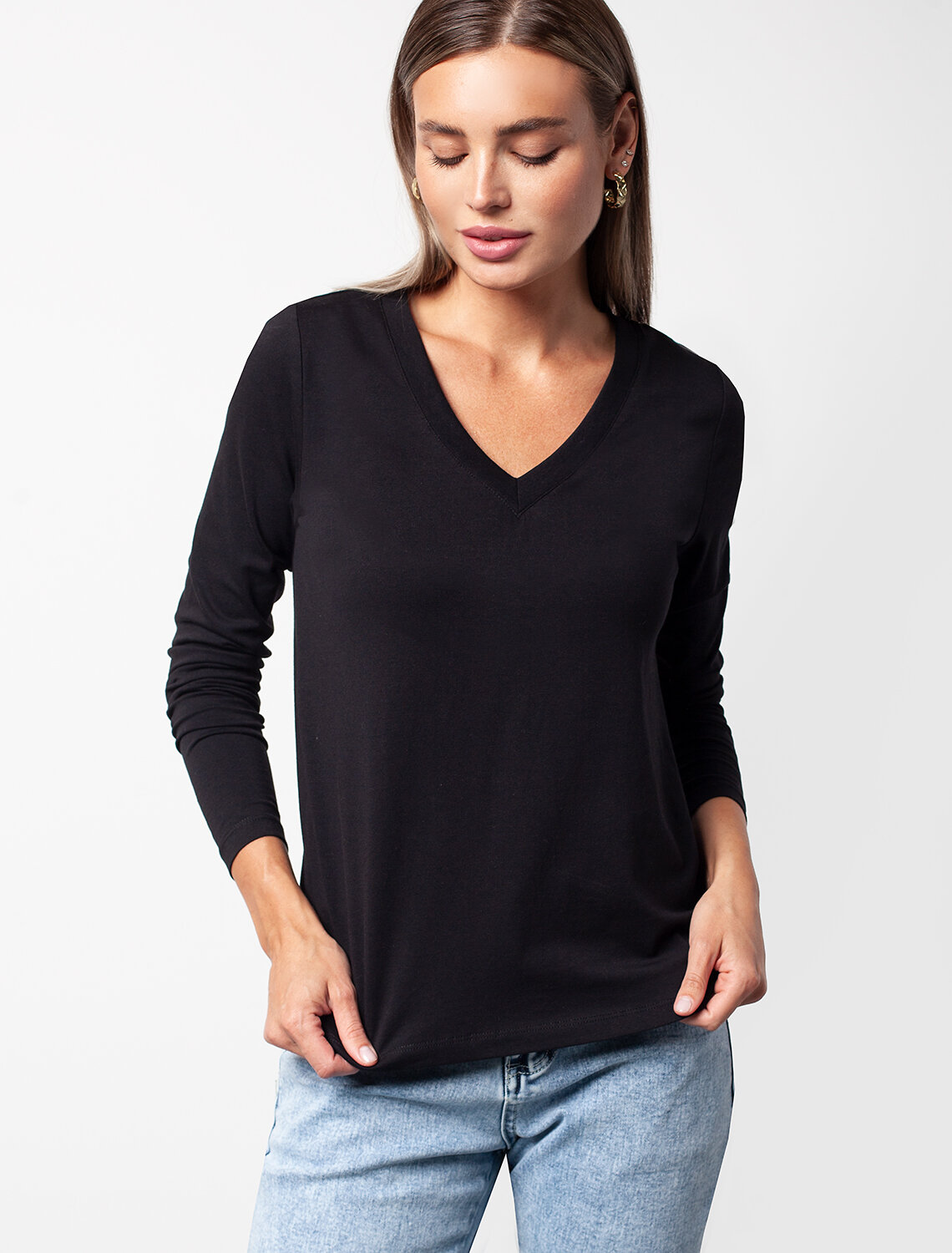 Черный джемпер с длинными рукавами и V-образным вырезом сшит из премиального хлопка. Однотонная хлопковая модель хорошо поддерживает комфортный для тела микроклимат. Благодаря вплетению эластановых волокон вещь хорошо сохраняет форму.