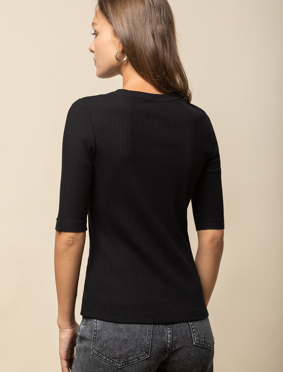 Футболка выполнена из фактурного трикотажа в широкий рубчик. Модель идеально сидит по фигуре не сковывая движения. Хлопковый трикотаж поддерживает оптимальную температуру тела, поэтому в изделии будет комфортно в течении всего дня. Наличие эластана в составе гарантирует формоустойчивости. Базовая модель впишется в любой гардероб.