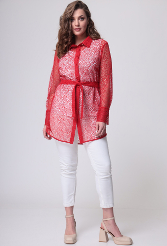 Блузка прямого силуэта, выполнена из трикотажного однотонного полотна «сетка». Перед блузки с нагрудными вытачками и центральной застежкой на петли и пуговицы. Спинка цельная, с отрезной кокеткой. Низ блузки переходит в закругленный боковой шов. Горловина круглой формы с воротником рубашечного типа на отрезной стойке. Рукав длинный, одношовный, по низу со складками. Низ рукава обработан притачной манжетой. Пояс в комплекте.