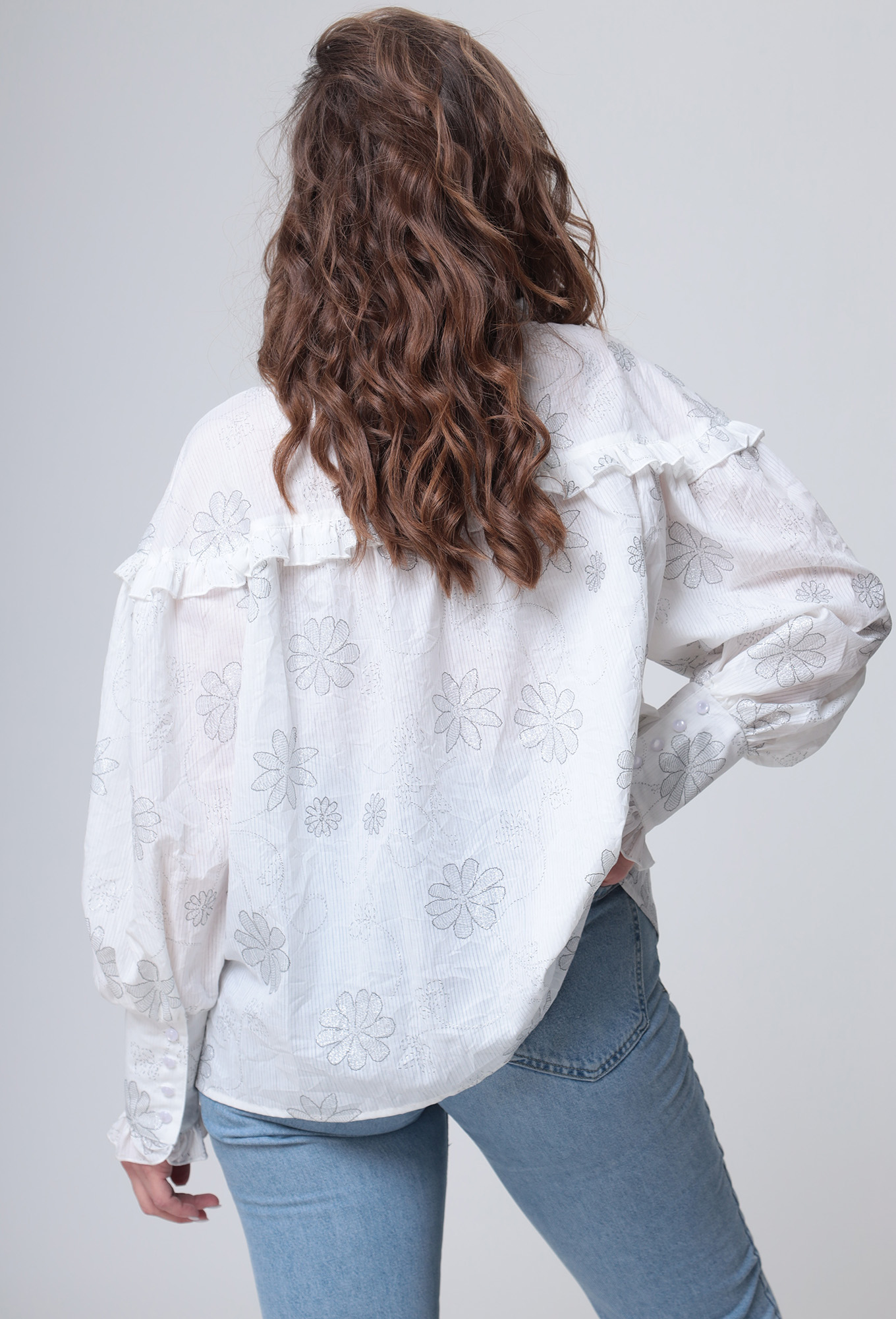 Блузка прямого силуэта. Перед блузки с отрезной плечевой кокеткой и центральной застежкой на петли и пуговицы. Спинка цельная, с отрезной плечевой кокеткой. Горловина круглой формы с воротником рубашечного типа на отрезной стойке, отлет воротника обработан рюшей. Рукав длинный, одношовный, по низу и по верху со сборкой. Низ рукава обработан притачной манжетой с застежкой на петли и пуговицы. Низ манжеты обработан рюшей. По шву стачивания переда с кокеткой, спинки с кокеткой и рукава с кокеткой обработана рюша со сборкой.