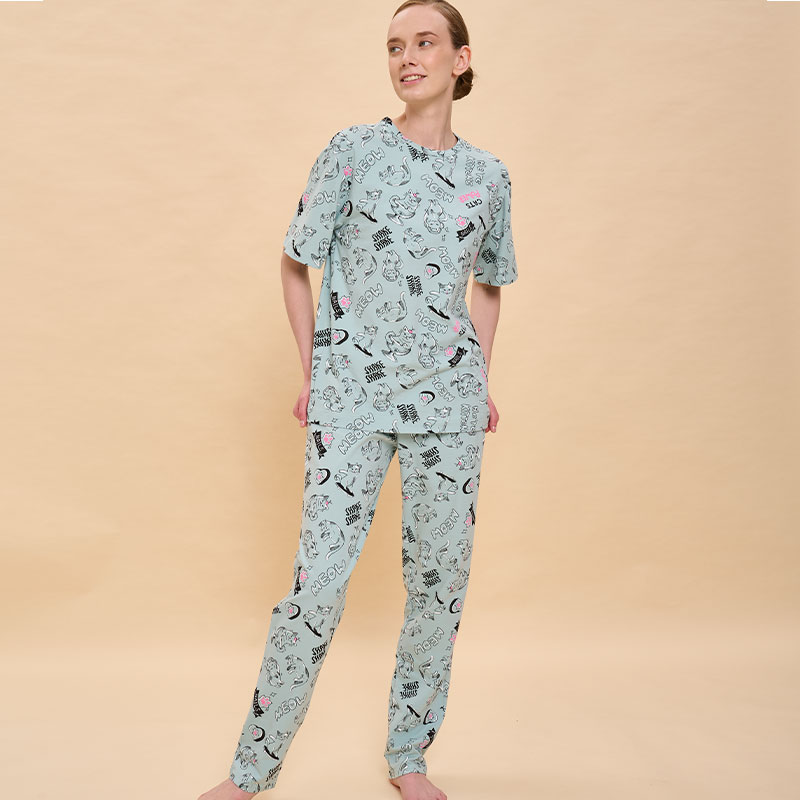 Состав: верх: 95%хлопок 5%эластан, низ: 95%хлопок 5%эластанОписание: Костюм пижамный женский. В составе ткани преобладает высококачественный хлопок — комплект для сна мягкий, гипоаллергенный и хорошо пропускает воздух. В хлопковой пижаме вам будет комфортно и уютно во время сна. Эластан помогает модели надолго сохранить первоначальную форму. Свободная футболка со спущенным плечом и широкими рукавами, брюки умеренного объёма — в пижаме очень удобно спать. В поясе брюк мягкая и широкая резинка — не перекручивается и не давит. Отделка горловины из эластичной рибаны — она не растягивается, пижаму удобно надевать и снимать. Хлопковая пижама украшена милым, «няшным» сплошным принтом с котиками, надписи переводятся: «сила кошек мяу», «двигайся-двигайся», «коготочки», «мы котики» — поймайте позитивное настроение! Пижамный костюм неприхотлив в уходе. Принты мягкие и прочные, без проблем переносят многочисленные стирки. Пижама женская с брюками подходит как для сна, так и просто для отдыха дома, пижамной вечеринки. Помните о правильном уходе за изделием: рекомендуется стирать при температуре не выше 30 °C, без предварительного замачивания, с изнанки. Это поможет сохранить качество и цвет пижамы на длительное время. Не забывайте о выборе правильного размера. Используйте таблицу размеров на фотографии, чтобы выбрать подходящий для себя вариант. Обратите внимание, что цвет товара на экране вашего устройства может отличаться от реального.