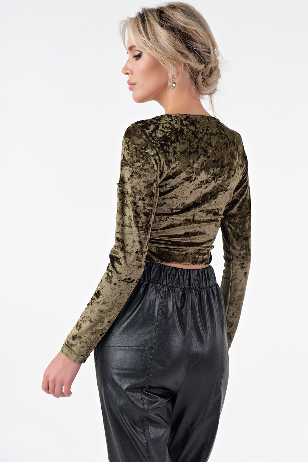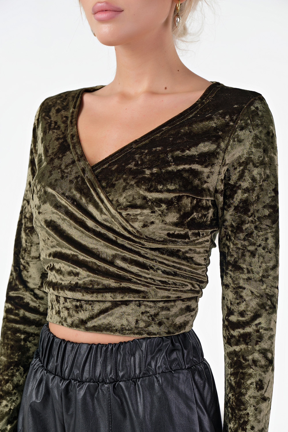 • Особенности: Топ прилегающего силуэта из трикотажного бархата. Детали: запах по переду, притачной пояс по низу топа, длинный втачной рукав. Без застежки.