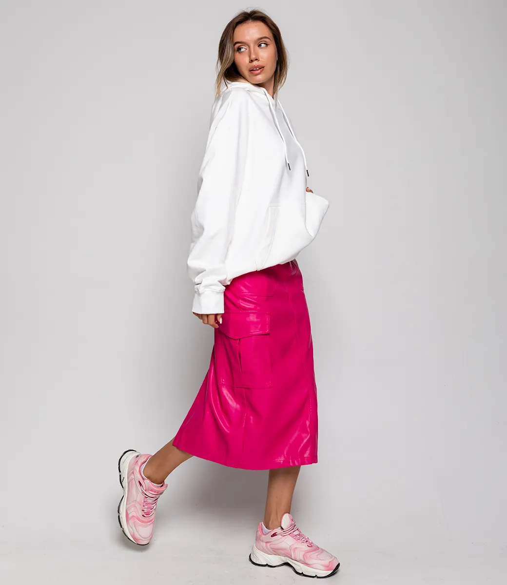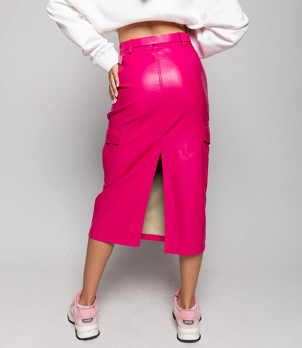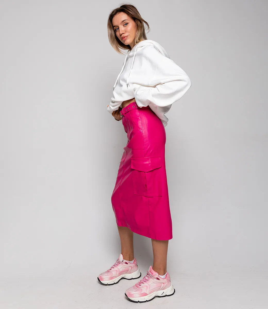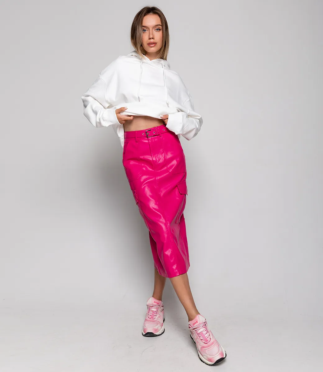 Юбка из эко-кожи с ремнем и небольшим разрезом сзади сделает образ более дерзким и притягательным.
