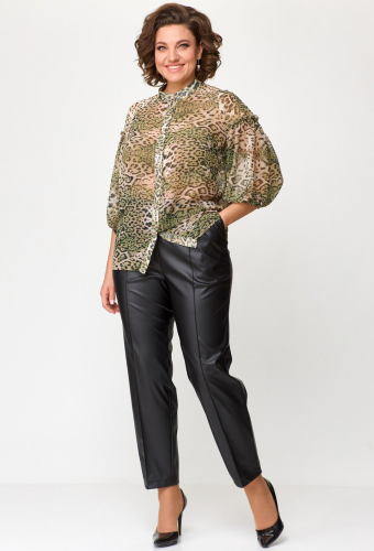 Блуза прямого силуэта с длинным рукавом с манжетой. Горловина V- образной формы с рубашечным воротником. По переду односторонняя складка с декоративной пришивной пластиной. По боковым швам – разрезы.