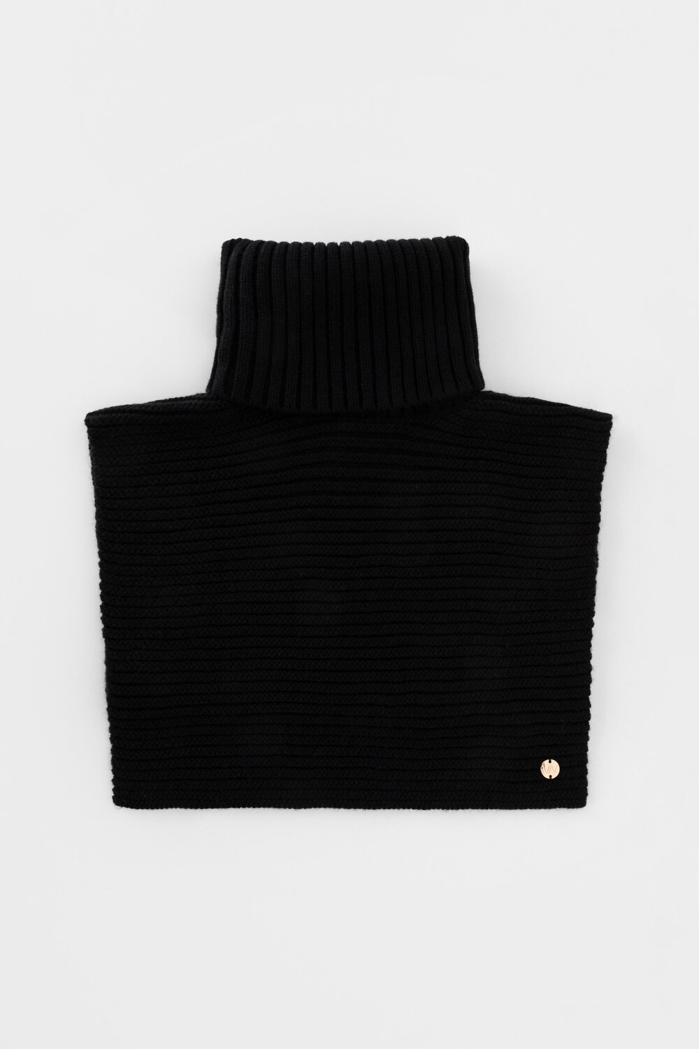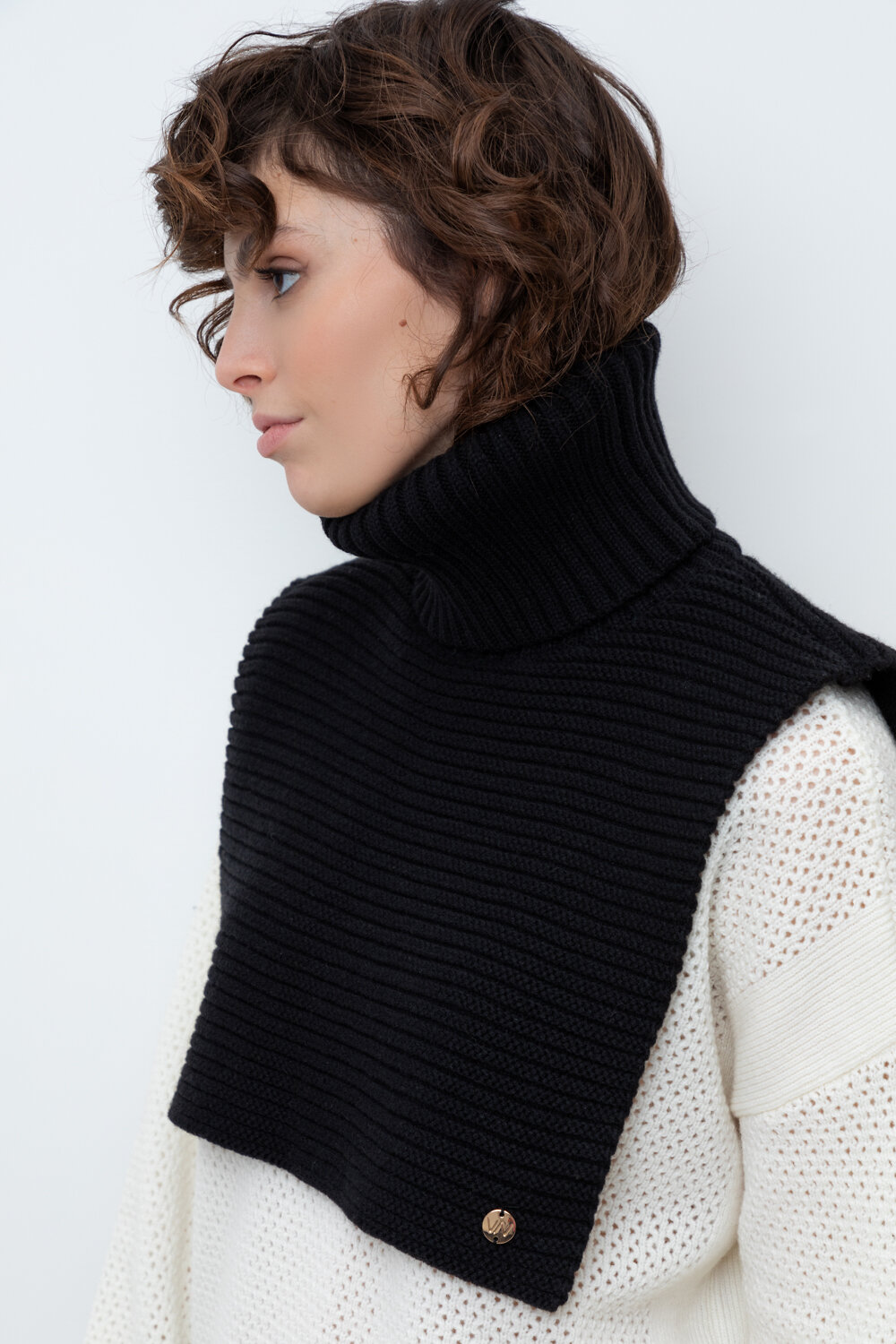 Уютная вязаная манишка с высоким воротником из шерсти и акрила. Шерсть в составе хорошо удерживает тепло, а волокна акрила делают изделие мягким и предотвращают деформацию и появление катышек. Лаконичный крой хорошо сочетается с верхней одеждой.