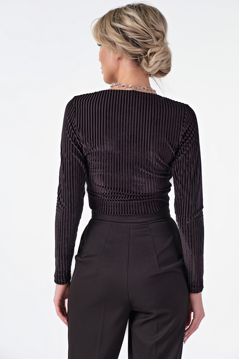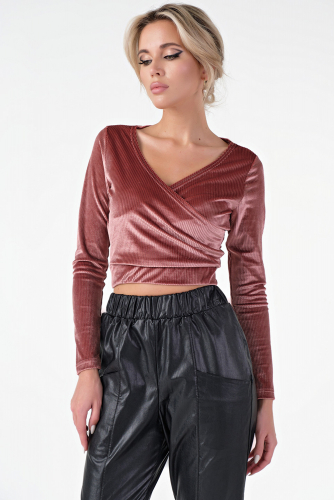 • Особенности: Топ прилегающего силуэта из трикотажного бархата. Детали: запах по переду, притачной пояс по низу топа, длинный втачной рукав. Без застежки.