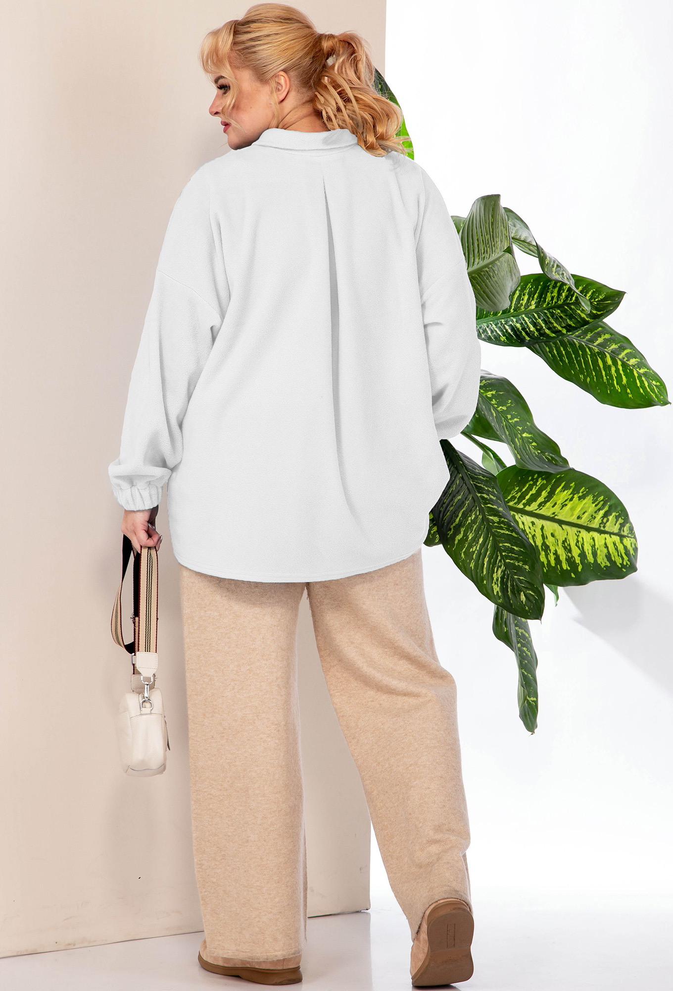 Блузка женская, прямого силуэта, из флисовой ткани со спущенным плечом. Застежка модели на планку и пуговицы, воротник на стойке, по полочке идет накладной карман, манжет рукава на резинке.