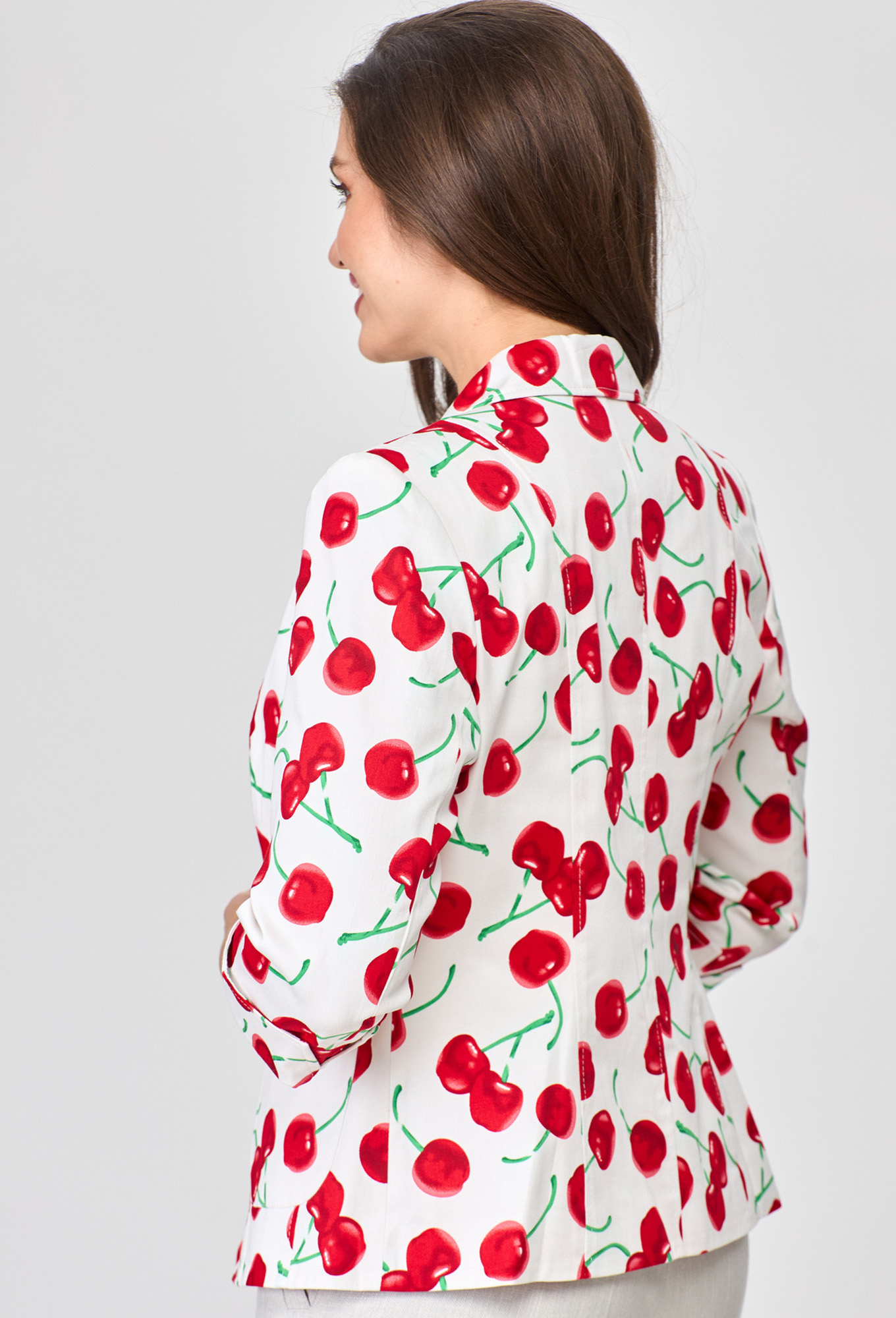 Жакет женский укороченный, полуприлегающего силуэта с центральной бортовой застежкой на пуговицы до линии перегиба лацкана. Спереди рельефные швы от плечевого шва,отрезной бочок и накладной карман. Спинка со средним швом и рельефами от плечевого шва. Рукав втачной, двухшовный, 3/4, с небольшим разрезом в локтевом шве. Воротник пиджачного типа. Жакет на х/б подкладке. Фурнитура может отличаться от студийного фото.