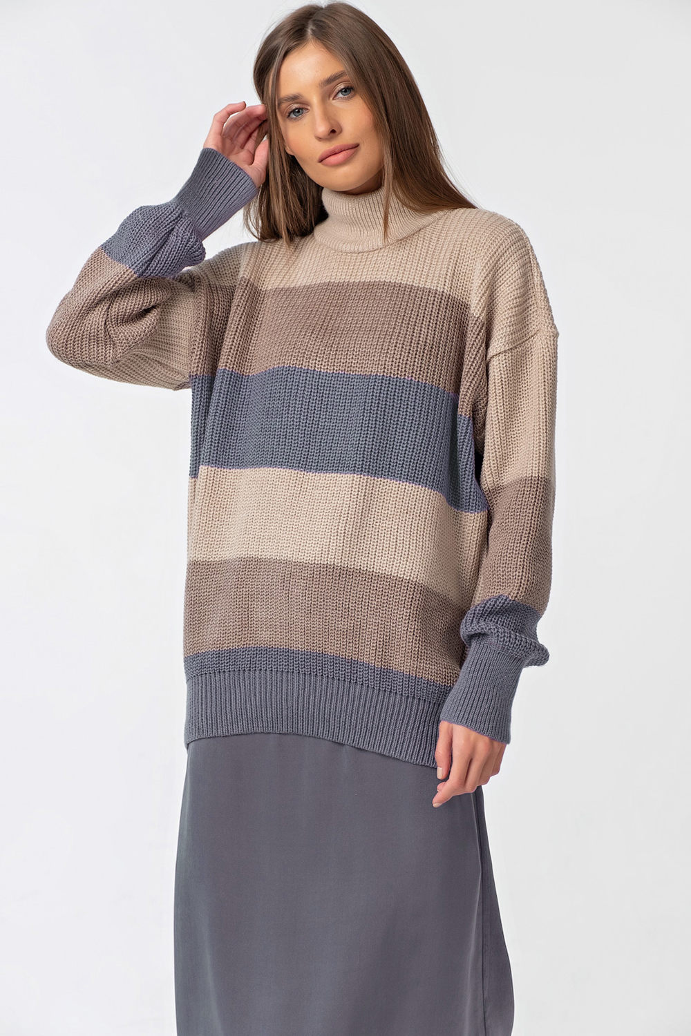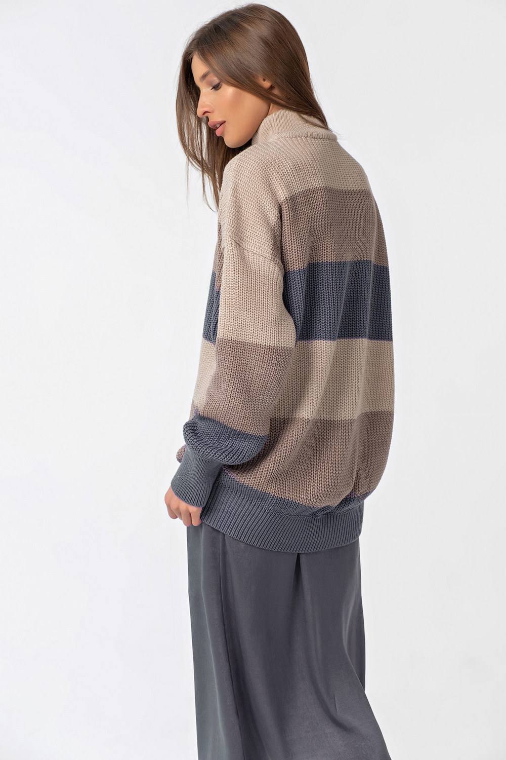 ст. цена1886руб.! Джемпер вязаный оверсайз с высоким горлом в полоску мультиколор