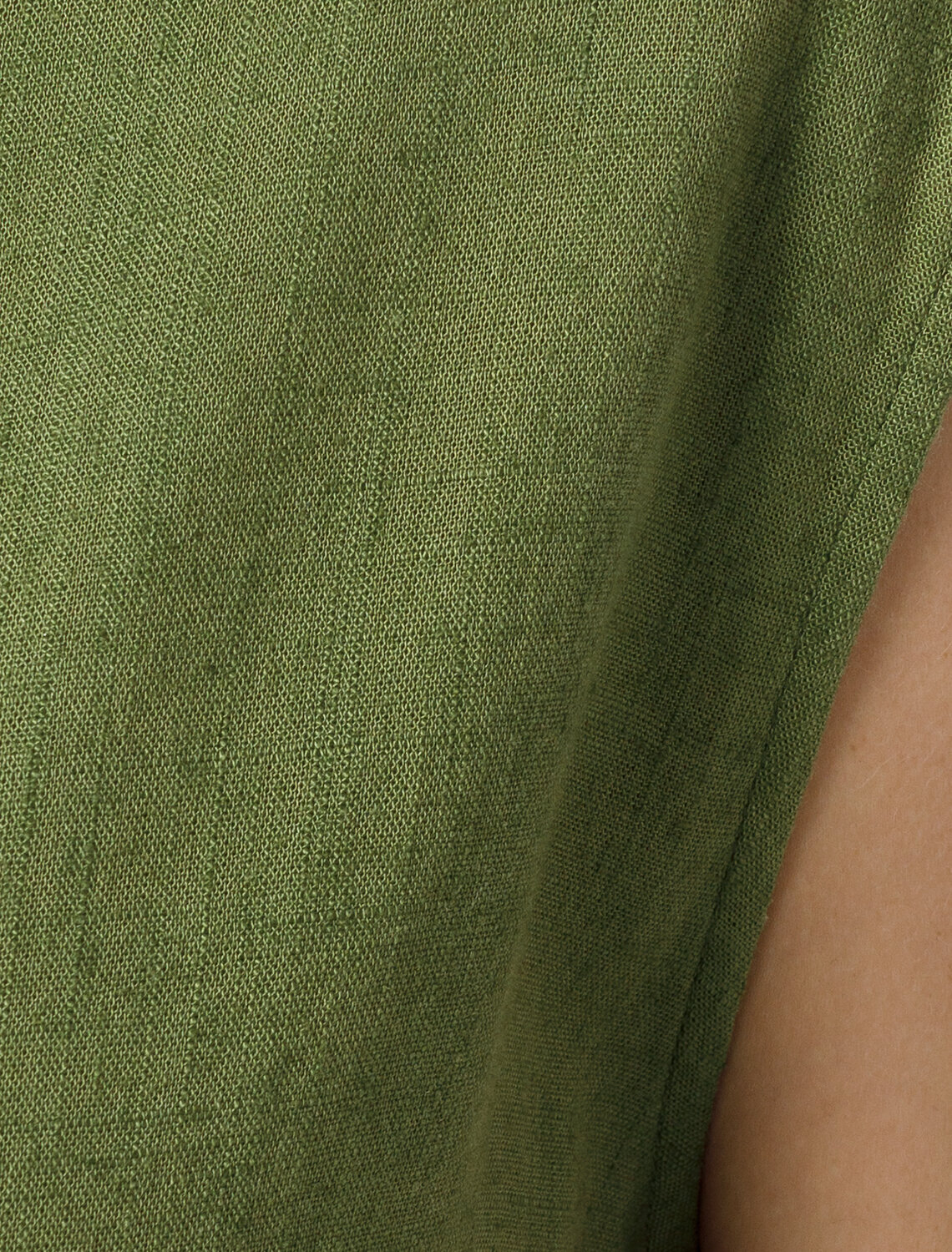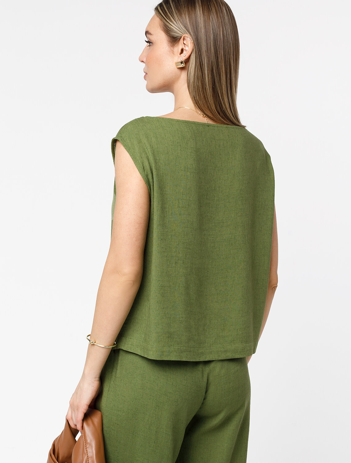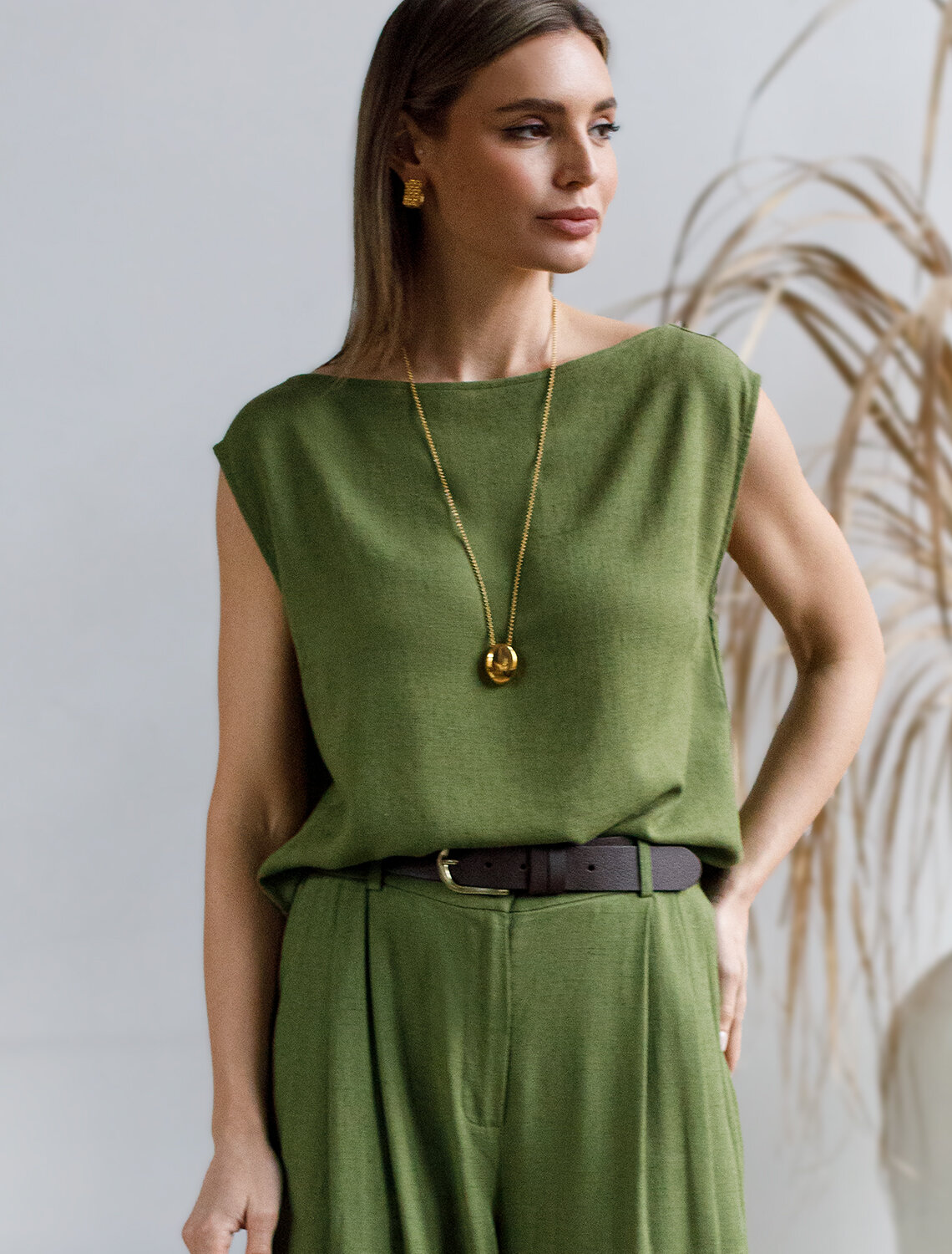 Лаконичный топ выполнен изо льна с вискозой. Изделие с горловиной формы лодочка, без застежек. Лён в составе обеспечивает прочность и воздухопроницаемость, вискоза эластичность и гладкость ткани. Благодаря такому сочетанию изделие хорошо драпируется, меньше мнется и сохраняет форму в течении долгого времени. Сочетается в костюме с брюками D24.222 и шортами D28.052