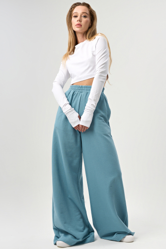 • Особенности: Брюки из футера расклешеного  силуэта. Детали: притачной пояс с резиной, карманы в боковых швах.