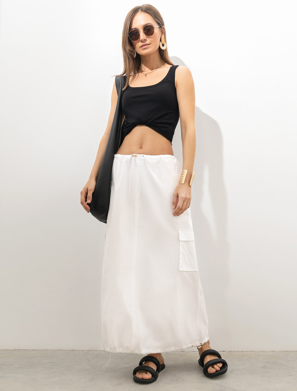 Трендовая юбка «карго» с поясом на резинке выполнена из плотного поплина. Низ изделия сделан на кулиске, что позволяет регулировать форму, используя платье по-разному в зависимости от образа. Материал прочный и износостойкий, но при этом мягкий и удобный, отлично подходит для повседневной носки, гарантируя абсолютный комфорт. Модель дополнена боковыми и двумя накладными карманами.