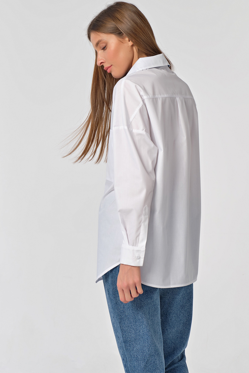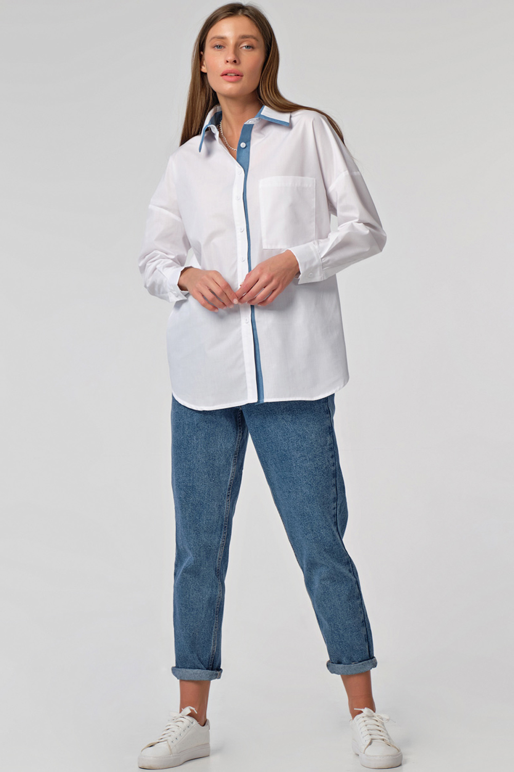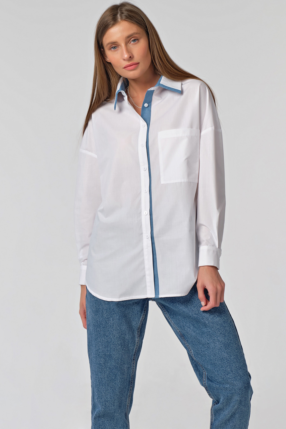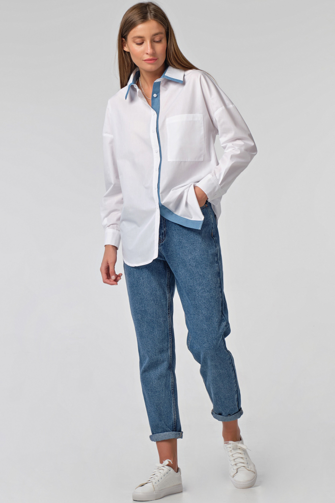 •     Особенности: рубашка прямого силуэта из сорочечной ткани. Детали: спущенная линия плеча, втачной рукав с манжетой, отложной воротник со стойкой, накладной карман на переде, кокетка по спинке, фигурная линия низа. Застежка на петли-пуговицы на планке. Нижняя планка и уголки воротника из отделочной ткани (под джинсу).