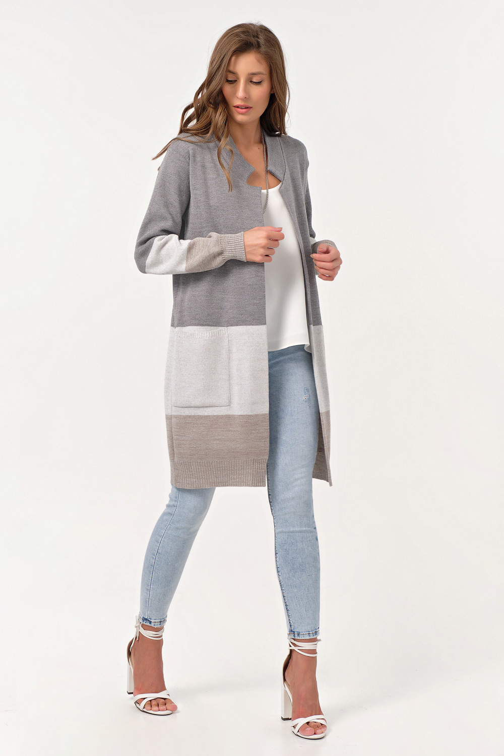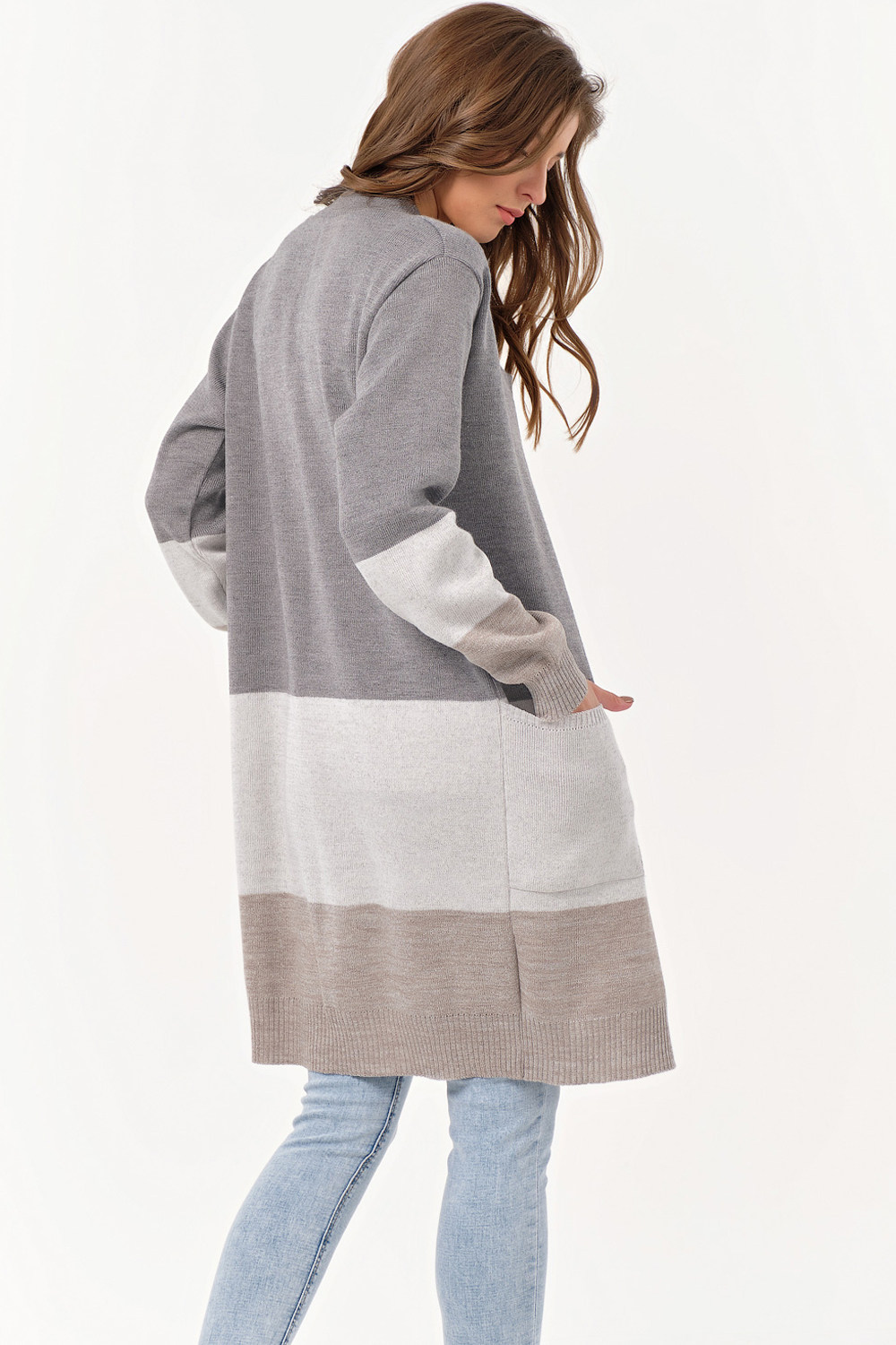 ст. цена2140руб.! Кардиган вязаный длинный в полоску серо-бежевый