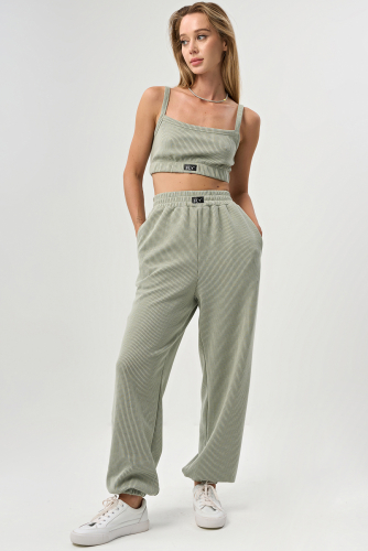 • Особенности: Брюки прямого силуэта из фактурного трикотажа. Детали: притачной пояс с резиной, притачная нашивка на поясе, карманы в боковых швах, притачные манжеты по низу.