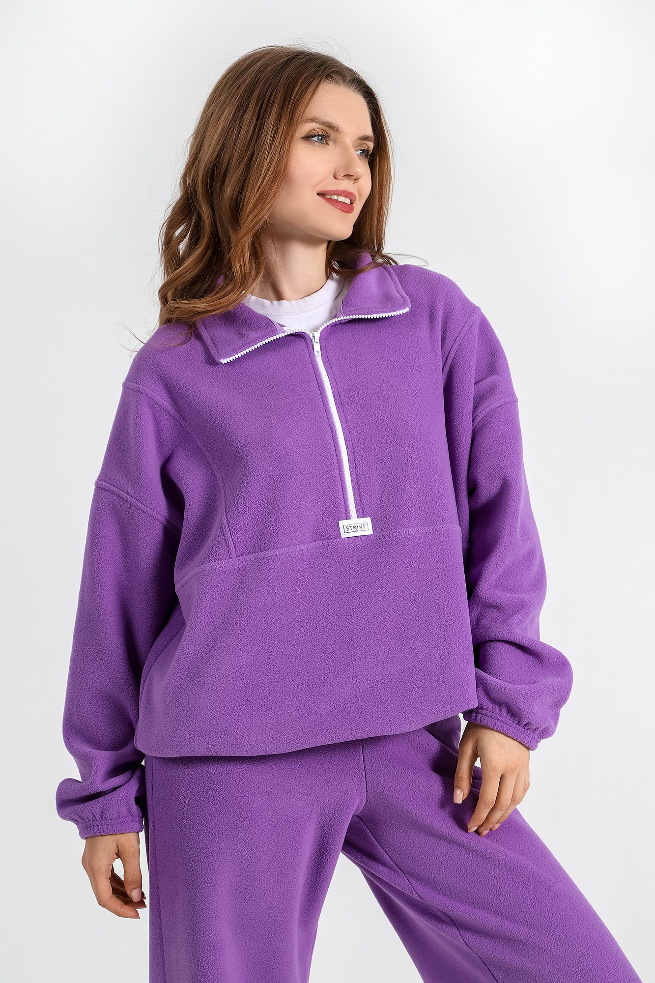 Костюм, состоящий из толстовки и брюк. Толстовка - свободного покроя, средней длины, с длинными рукавами на основе цельнокроеных. Деталь переда - с отрезной кокеткой, состоящей из четырех деталей, симметрично расположенных относительно центрального шва, обработанного с застежкой на тесьму "молния". Спинка - с отрезной кокеткой. Нижние срезы рукавов обработанышвом вподгибку с эластичной тесьмой. Низ изделия обработан швом вподгибку. По всем основным соединительным швам толстовки настрочены отделочные строчки. Брюки - длинные, свободного покроя, на притачном поясе с эластичной тесьмой внутри и карманами в боковых швах. Нижние срезы обработаны швом вподгибку с эластичной тесьмой. По низу джемпера и низу брюк - эластичная тесьма с фиксаторами для регулировки ширины изделий на этих участках.