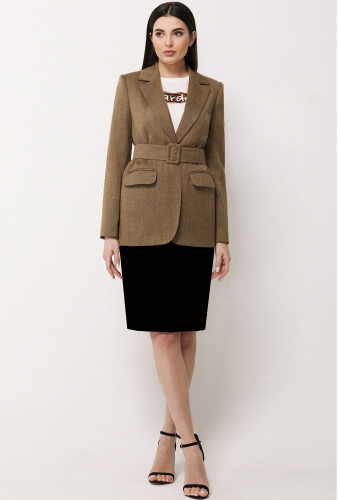 Комфортный однобортный жакет. Перед с центральной застежкой на петлю и пуговицу и двумя горизонтальными карманами с рамками и клапанами. Средний шов спинки заканчивается шлицей. Рукава втачные двушовные. Воротник отложной с лацканами. Линия талии подчёркивается поясом с пряжкой из основной ткани. На подкладке.