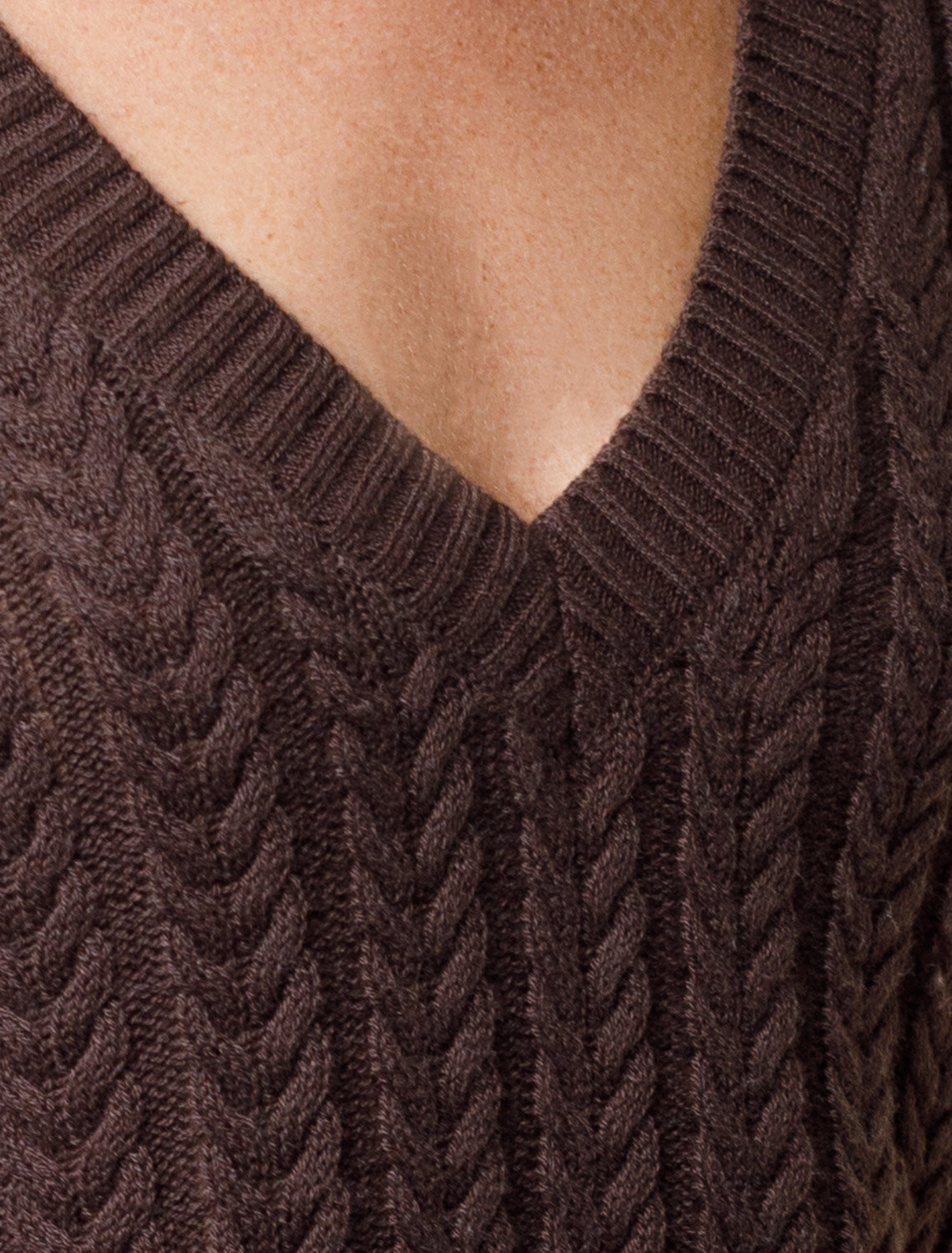 Джемпер фактурной вязки выполнен из хлопка с добавлением кашемира. Модель с V-вырезом с вывязанным орнаментом цепи. Мягкая и очень приятная пряжа совершенно не колется, сохраняет тепло при этом не перегревая, гарантируя безупречный комфорт.