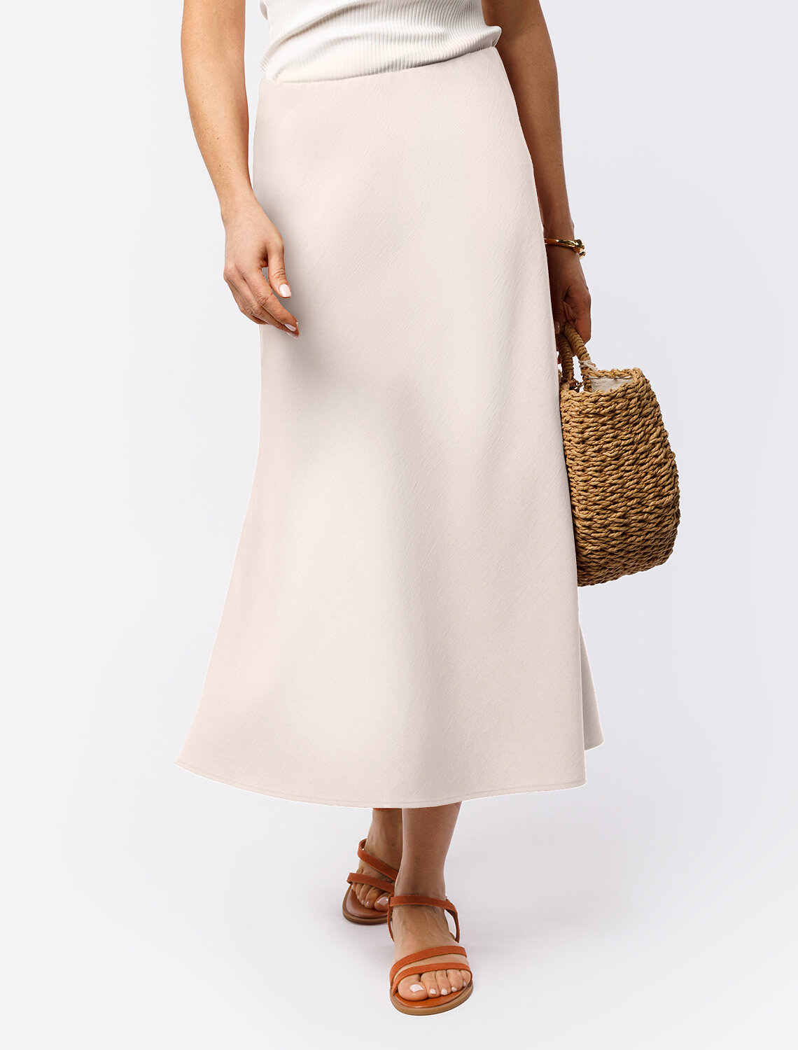 Юбка с разрезом выполнена из плотного лиоцелла. Модель, скроенная по косой мягко, струится по телу и отлично драпируется. Удобный пояс на эластичной резинке. В теплое время года ткань приятно охлаждает кожу. Добавление синтетических волокон в составе изделия, предотвращает сминаемостьи поддерживает формоустойчивость. Юбка сочетается в костюме с топом D23.063, блузкой D29.266, D29.267 и жилетом D27.002