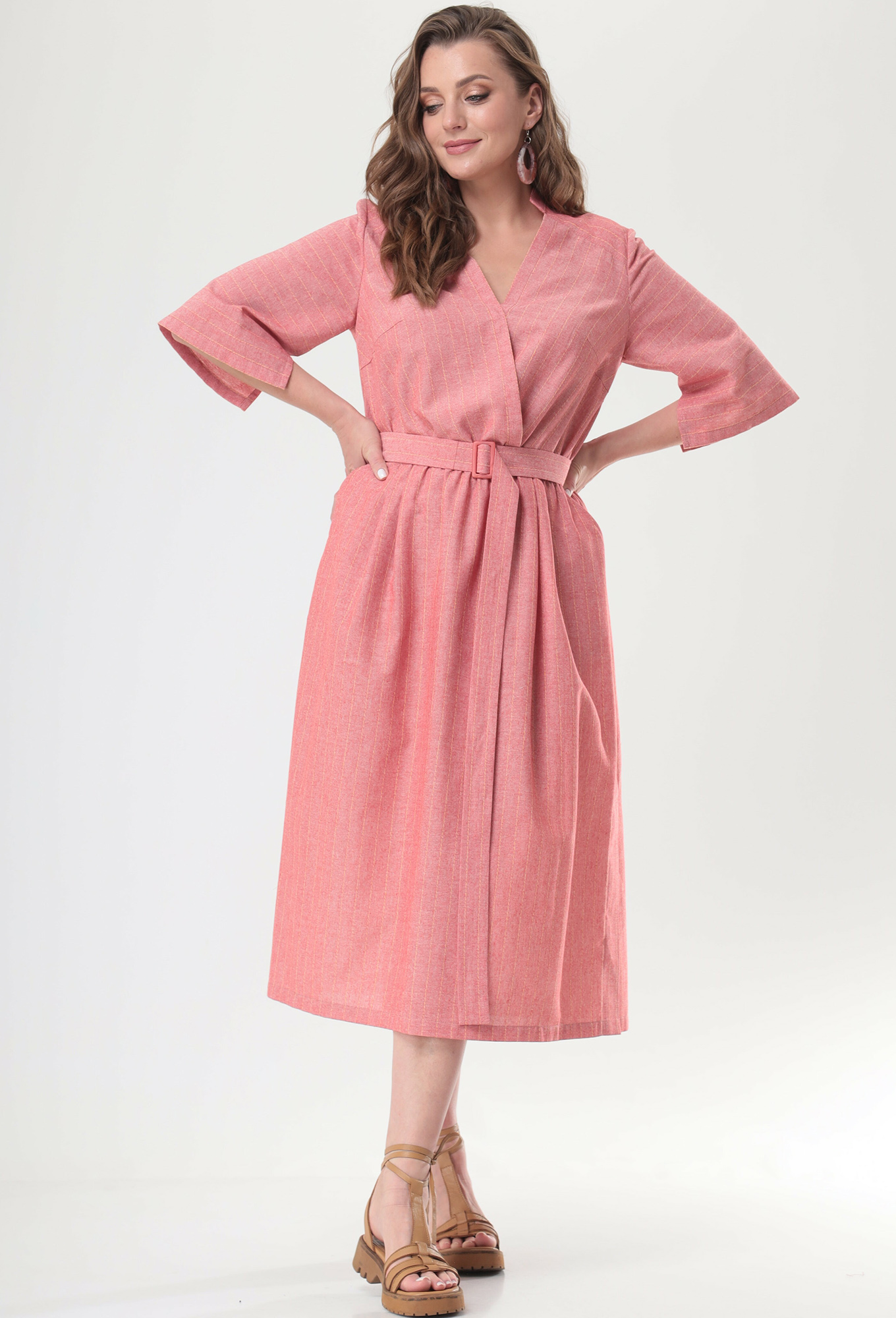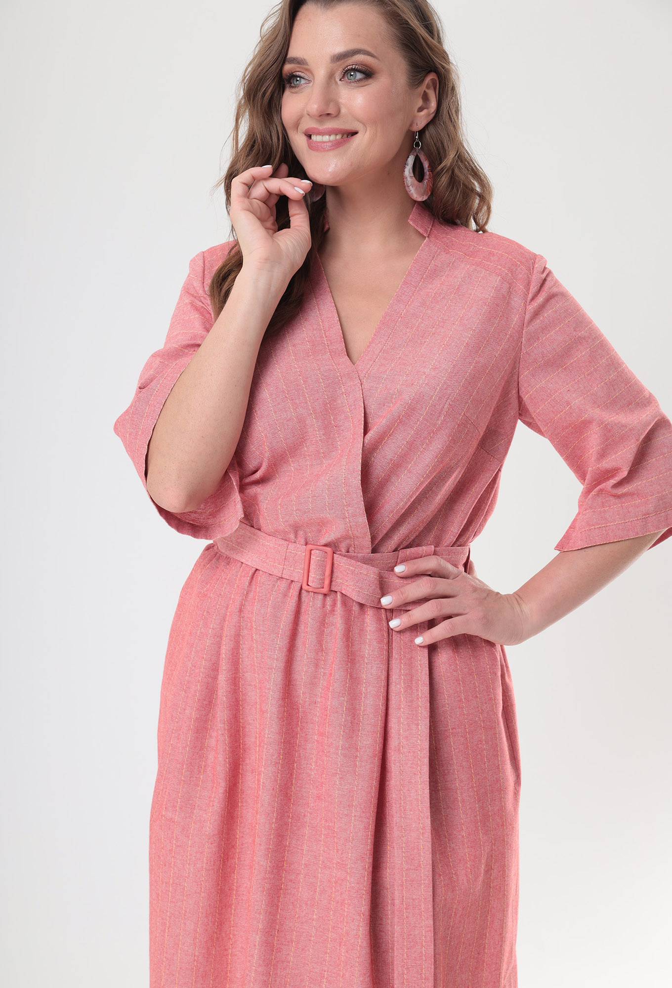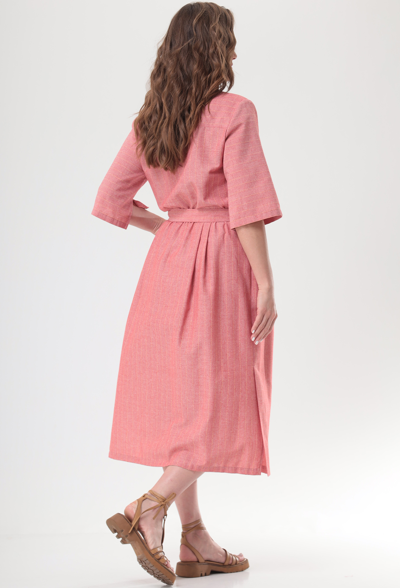 Платье свободного силуэта, длиной миди, выполнено из ткани в полоску. Платье отрезное по линии талии. Полочка лифа платья с нагрудными вытачками и запахом на правую сторону. В верхней части полочки обработаны отрезные кокетки, горловина V-образной формы, с воротником стойкой. Спинка лифа с отрезной плечевой кокеткой .Рукав втачной, одношовный, длиной за локоть. По нижнему шву рукава обработан разрез. Юбка платья со складками и резинкой по шву притачивания к юбке . По передней части юбки обработаны наклонные карманы. По боковым швам в области талии настрочены шлевки через которые продет пояс с пряжкой. В нижней части боковых швов обработаны шлицы.