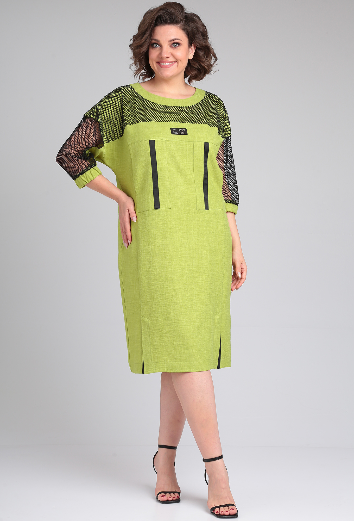 Платье прямого силуэта, длиной за колено выполнено из однотонной ткани, в качестве отделки использована контрастная по цвету однотонная сетка.