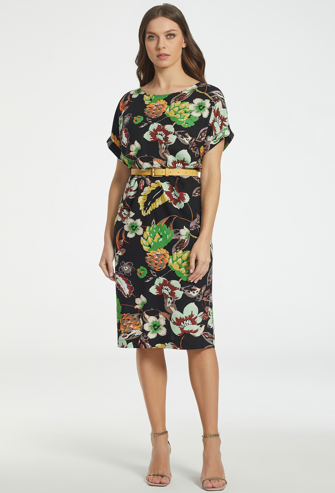 Элегантное платье с ярким принтом – лёгкий и верный способ произвести впечатление. Модель выполнена из приятного к телу итальянского 100% вискозного полотна. С округлой формой горловины, со спущенными цельнокроеными рукавами с манжетами и застежкой на одну навесную петлю и пуговицу по спинке. Акцентировать внимание на талии помогает широкий пояс-ремень с пряжкой.