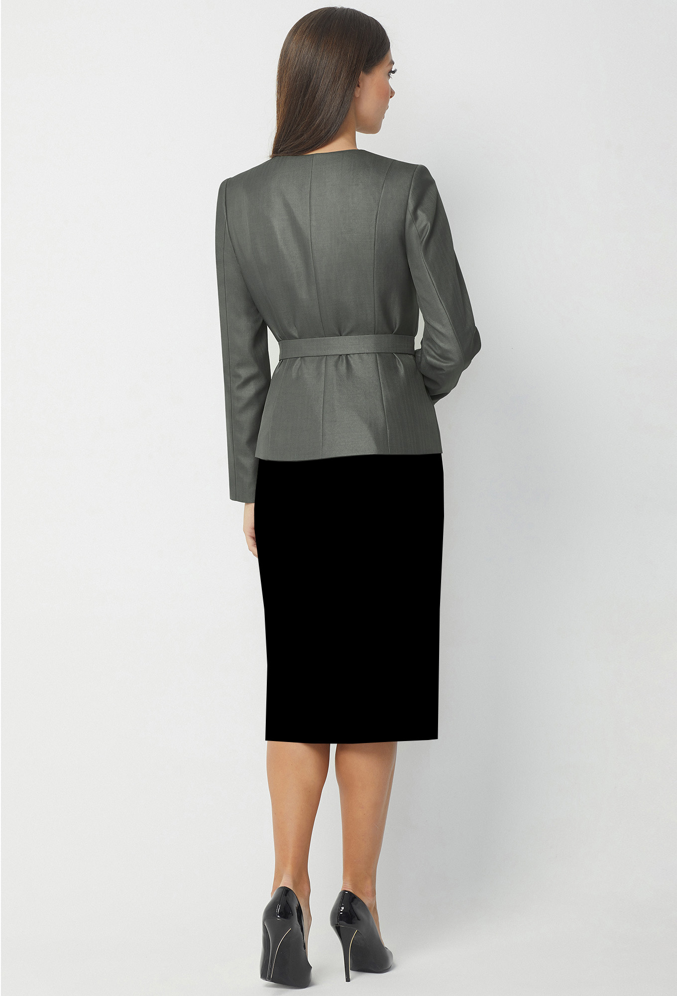 Однобортный жакет полуприлегающего силуэта с потайной застёжкой, с V-образным вырезом горловины по переду и овальной по спинке. Перед с двумя вертикальными рельефами и четырьмя отделочными рамками, через которые проходит пояс с пряжкой из основной ткани. Спинка со средним швом и двумя рельефами. Рукава втачные двухшовные. На подкладке.