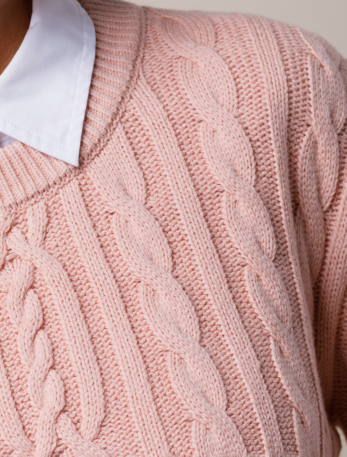 Свитер выполнен из мягкой хлопковой пряжи фактурной вязки с добавлением акрила. Модель связана изнаночной петлей, в сочетании с которой узор косы и высокие рибаны поддерживают ирландский стиль, который всегда в тренде. Круглый вырез. Свободная посадка.