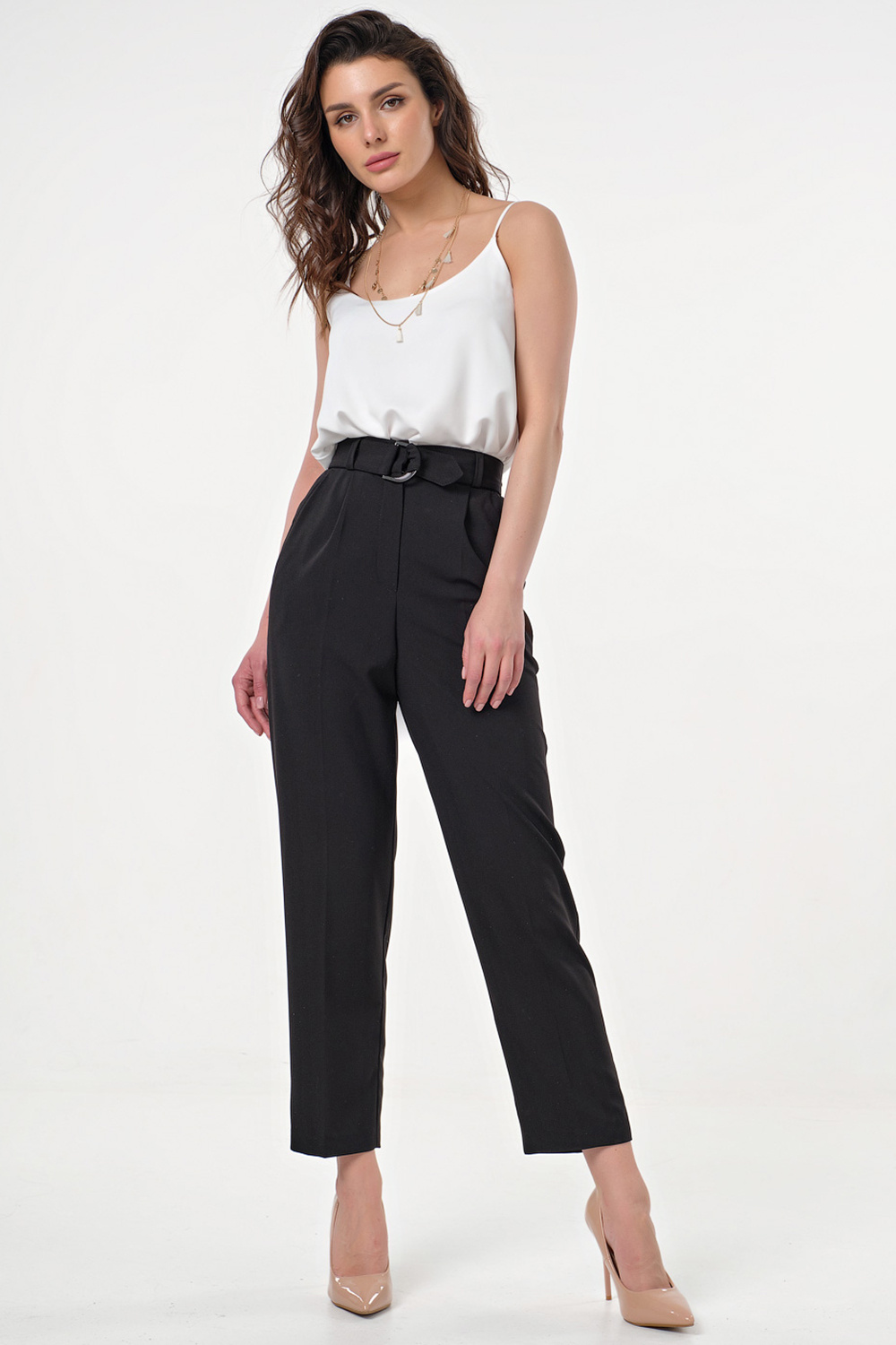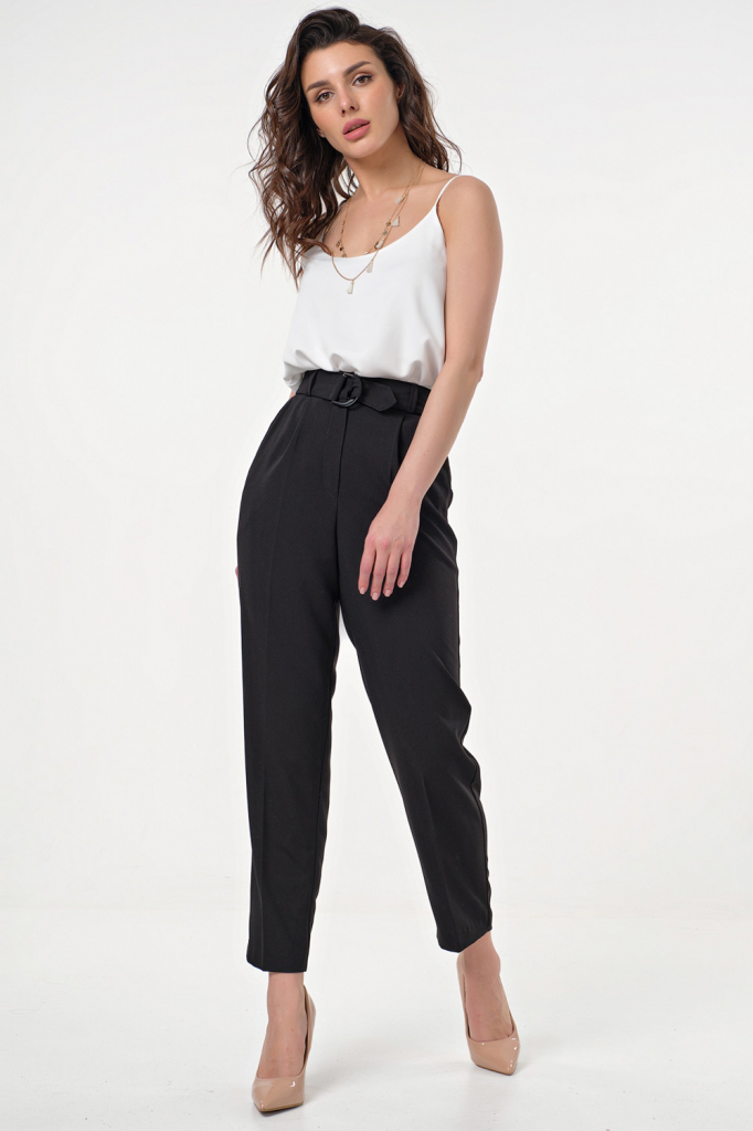 • Особенности: Брюки прямого силуэта на притачном поясе. Детали: брючные карманы, шлевки на поясе, по переду заложены складки, пояс-ремень из основной ткани с пряжкой в комплекте. Застежка на молнию и пуговицу.