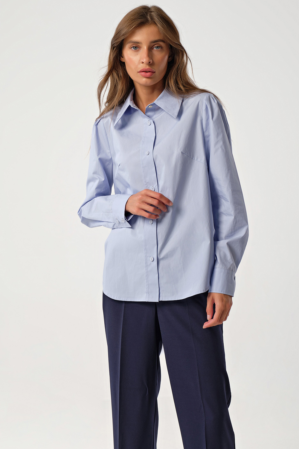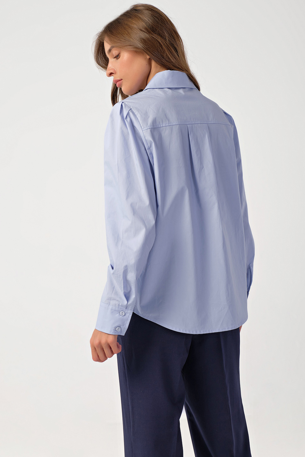 • Особенности: Рубашка прямого силуэта из сорочечной ткани. Детали: отложной воротник со стойкой, втачной рукав со складками по окату, притачная манжета с застежкой на пуговицы, кокетка по спинке, планка по переду с застежкой на петли-пуговицы.