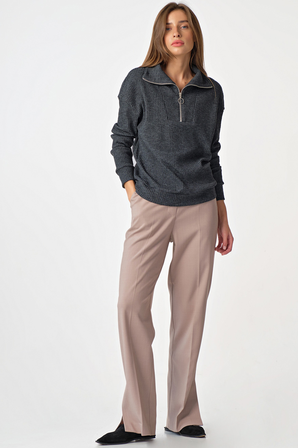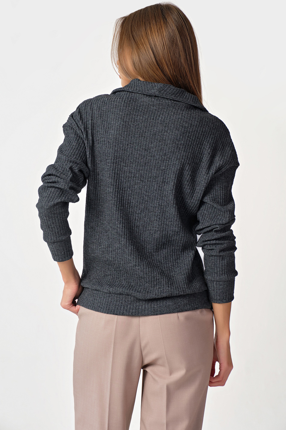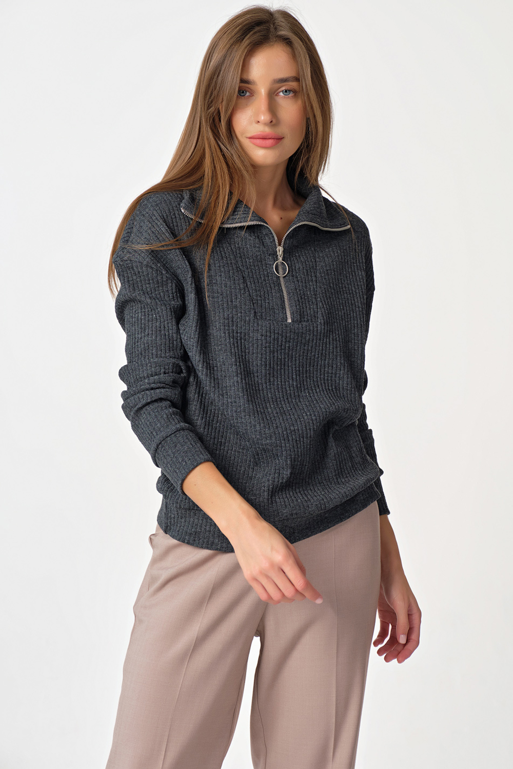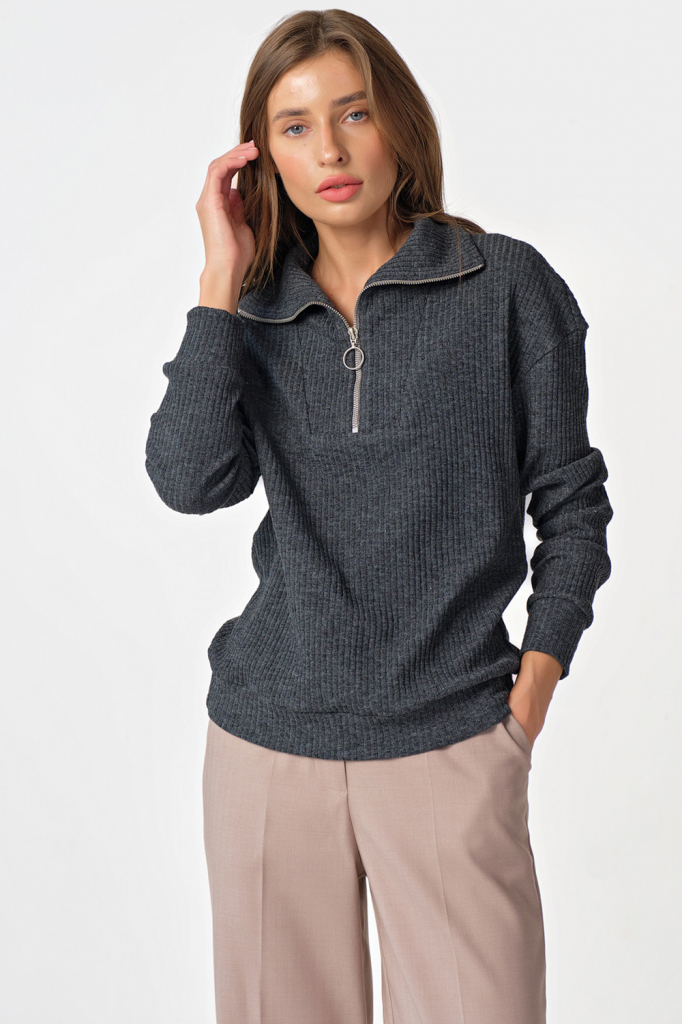 Особенности: Джемпер прямого силуэта из фактурного трикотажа. Детали: воротник-стойка переходящий в широкую планку переда, застежка на молнию по переду, спущенная линия плеча, втачной рукав с притачной манжетой, притачная манжета по низу джемпера.