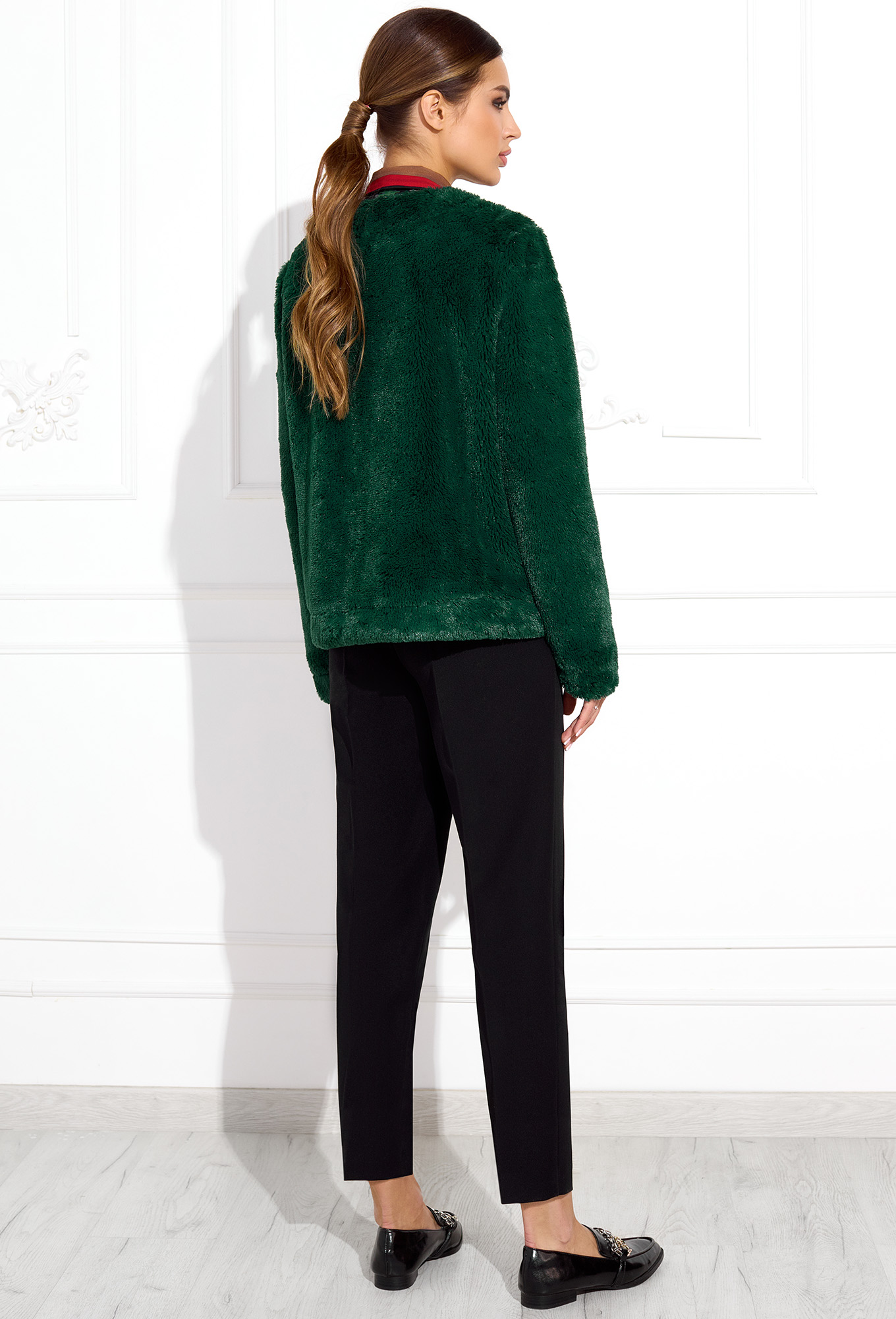 Жакет прямого силуэта. По центру полочки вставлена разъемная молния закрытая цельнокроенной планкой. В боковых швах обработаны карманы. Рукав втачной одношовный. Горловина обработана обтачкой.