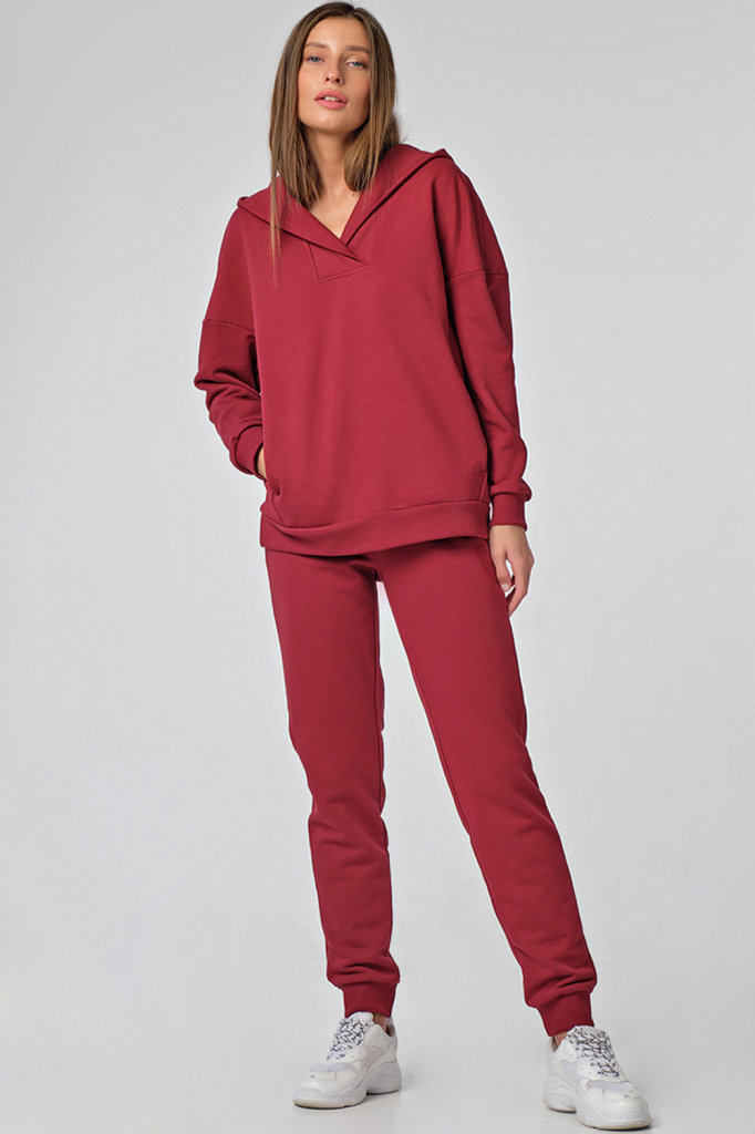 • Особенности:  костюм из футера состоит из свитшота и брюк. Детали свитшота: свободный силуэт, капюшон переходящий в планку переда, спущенная линия плеча, втачной рукав с притачной манжетой из кашкорсе, боковые швы со смещением на перед, карманы в боковых швах, притачной пояс по низу свитшота. Детали брюк: притачной пояс с резиной, манжеты из кашкорсе по низу брючин, без карманов.