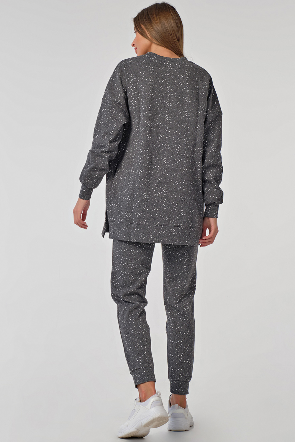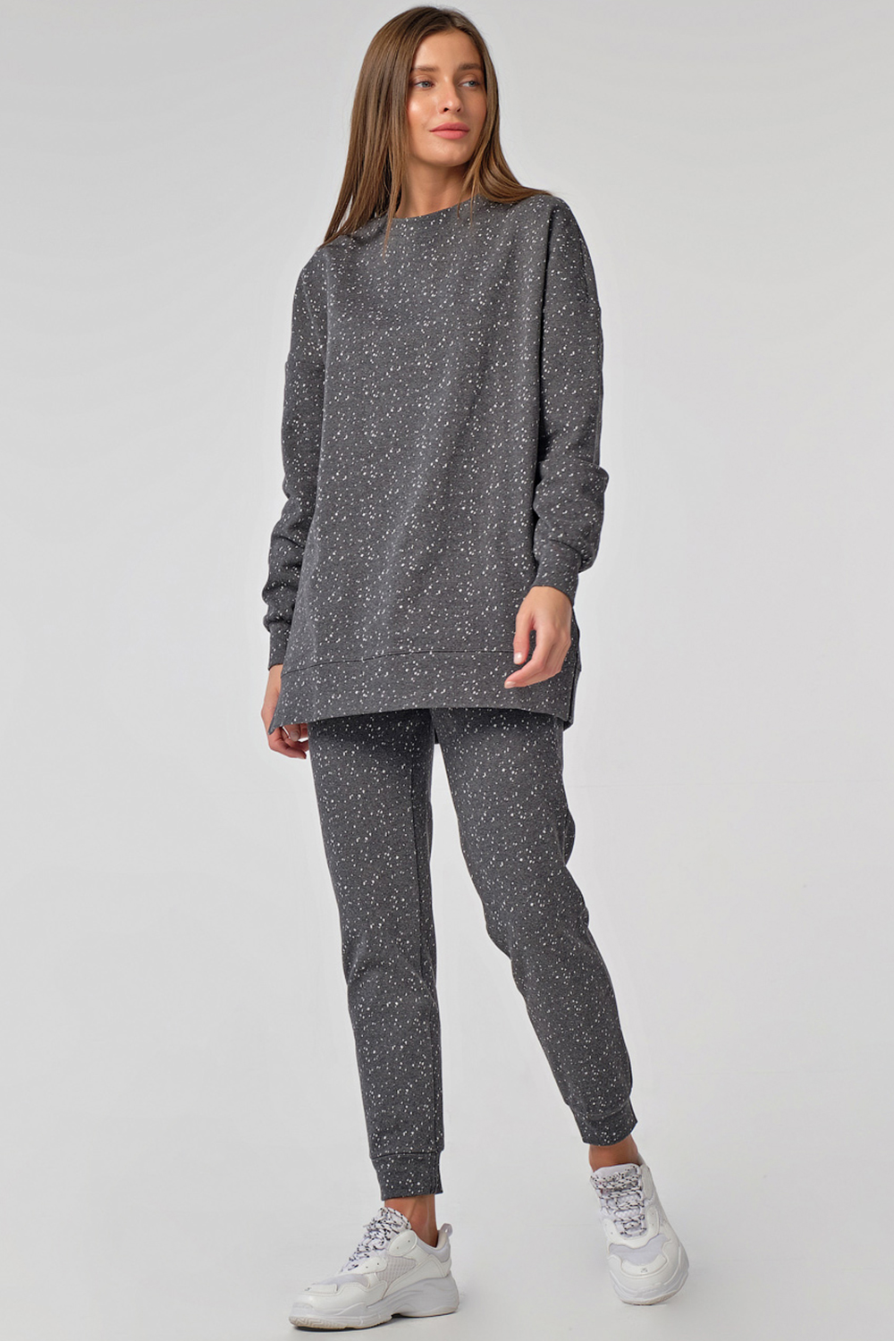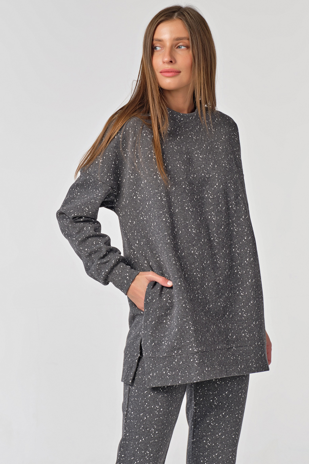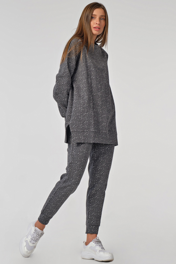 • Особенности: Костюм из плотного трикотажа в крапинку состоит из свитшота и брюк. Свитшот свободного силуэта, горловина обработана бейкой, рукав длинный со спущенной проймой, по низу изделия - манжета, разрезы в боковых швах, карманы в боковых швах. Брюки полуприлегающего силуэта, заужены книзу, на манжете.