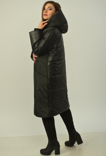 Пальто зимнее, женское, полуприлегающего силуэта , с центральной застёжкой на тесьму-молнию, планку с потайными кнопками. По переду рельефные швы от проймы, прорезные карманы с широкими листочками. Рукав втачной одношовный, с притачным манжетом по низу (довяз). Капюшон с центральной частью с отделочной деталью по отлету. В качестве отделки используется строчка и фурнитура. Используется 2 ткани.