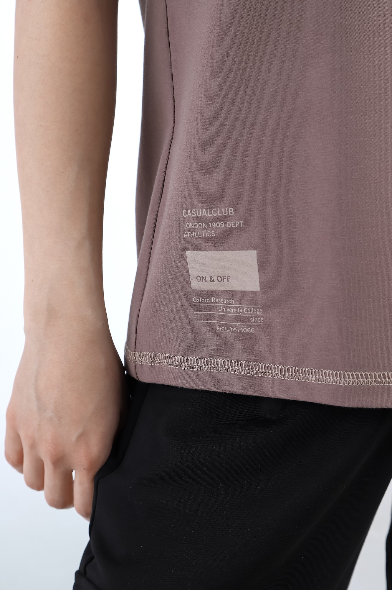 Футболка из гладкокрашенного трикотажного полотна «кулирка» с лайкрой, свободного силуэта, с короткими втачными рукавами, горловиной овальной формы, обработанной втачной планкой. На полочке принт, выполненный в технике «шелкографии». По рукавам, переду, горловине и низу изделия настрочена декоративная отделочная строчка.