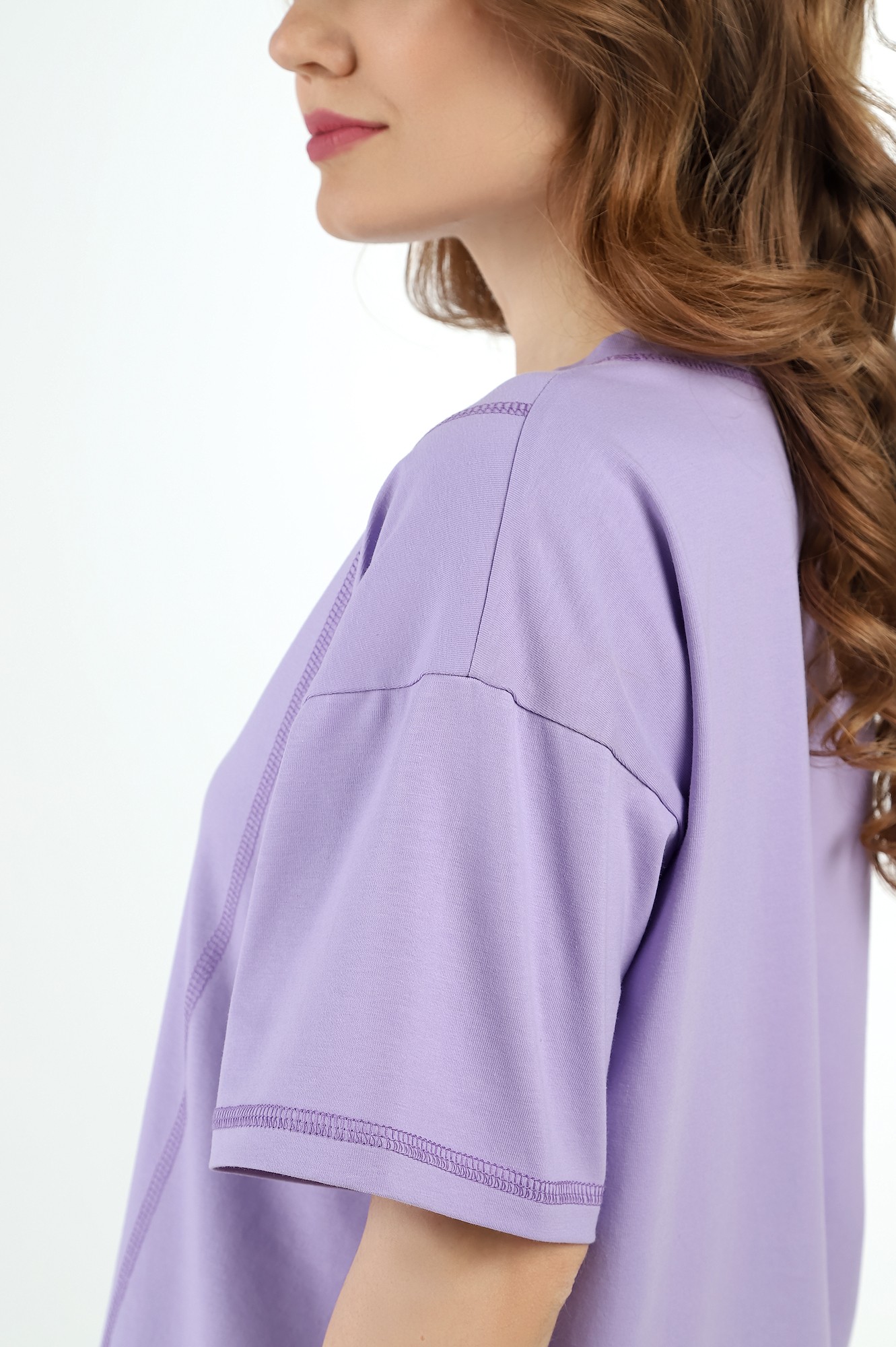 Футболка из гладкокрашенного трикотажного полотна «кулирка» с лайкрой, свободного силуэта, с короткими втачными рукавами, горловиной овальной формы, обработанной втачной планкой. На полочке принт, выполненный в технике «шелкографии». По рукавам, переду, горловине и низу изделия настрочена декоративная отделочная строчка.
