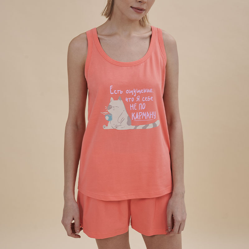 Состав: верх: 95%хлопок 5%эластан, низ: 95%хлопок 5%эластанОписание: Домашний комплект женский с шортами и майкой – комфортная повседневная одежда для дома. Домашняя одежда всегда должна быть изысканной, создавать чувство уверенности и красоты. Майка свободного кроя на широких бретелях дарит комфорт и свободу движений. Удобная майка с позитивным принтом – стильная деталь женского гардероба. Забавный принт в виде котика с чашкой кофе и надписью "Есть ощущение, что я себе не по карману" эластичный и прочный, отлично переносит частые стирки. В составе ткани изделия преобладает высококачественный хлопок – пижама мягкая и отлично пропускает воздух, позволяя коже дышать. Эластан помогает модели сохранять первоначальную форму. Шорты свободного кроя, средней длины – для удобства и комфорта. Шортики женские на широкой эластичной резинке – она не давит и не перекручивается. В линейке представлены следующие размеры: XS (42), S (44), M (46), L (48). Женский пижамный костюм подходит как женщинам, так и девушкам, девочкам-подросткам. Модель выполнена в актуальном розовом цвете. Комплект женский домашний идеален для комфортного сна, пижамной вечеринки. Топ свободного кроя подходит для повседневного летнего гардероба, прогулок, отдыха. А также пижама хлопковая женская удобна для беременных и кормящих. Домашний женский комплект из майки и шорт – чудесный подарок для мамы, сестры или подруги на любой праздник. Выбирайте нужный размер по таблице размеров на фото. Цвет товара на экране вашего устройства может отличаться от цвета изделия вживую.