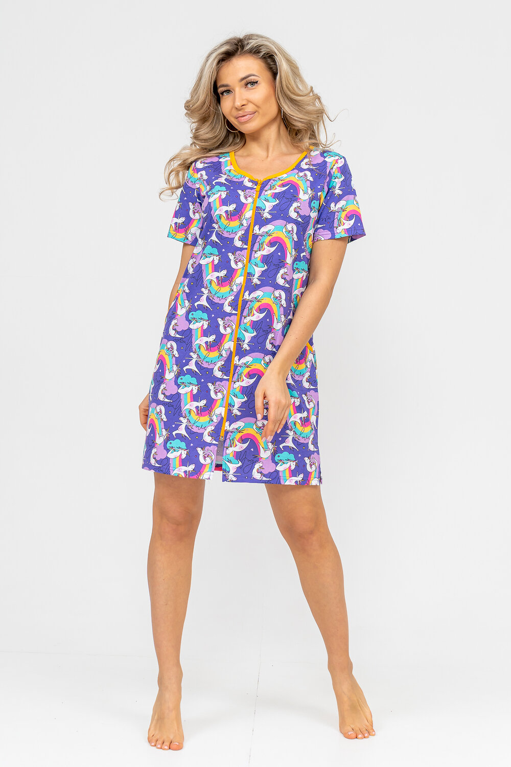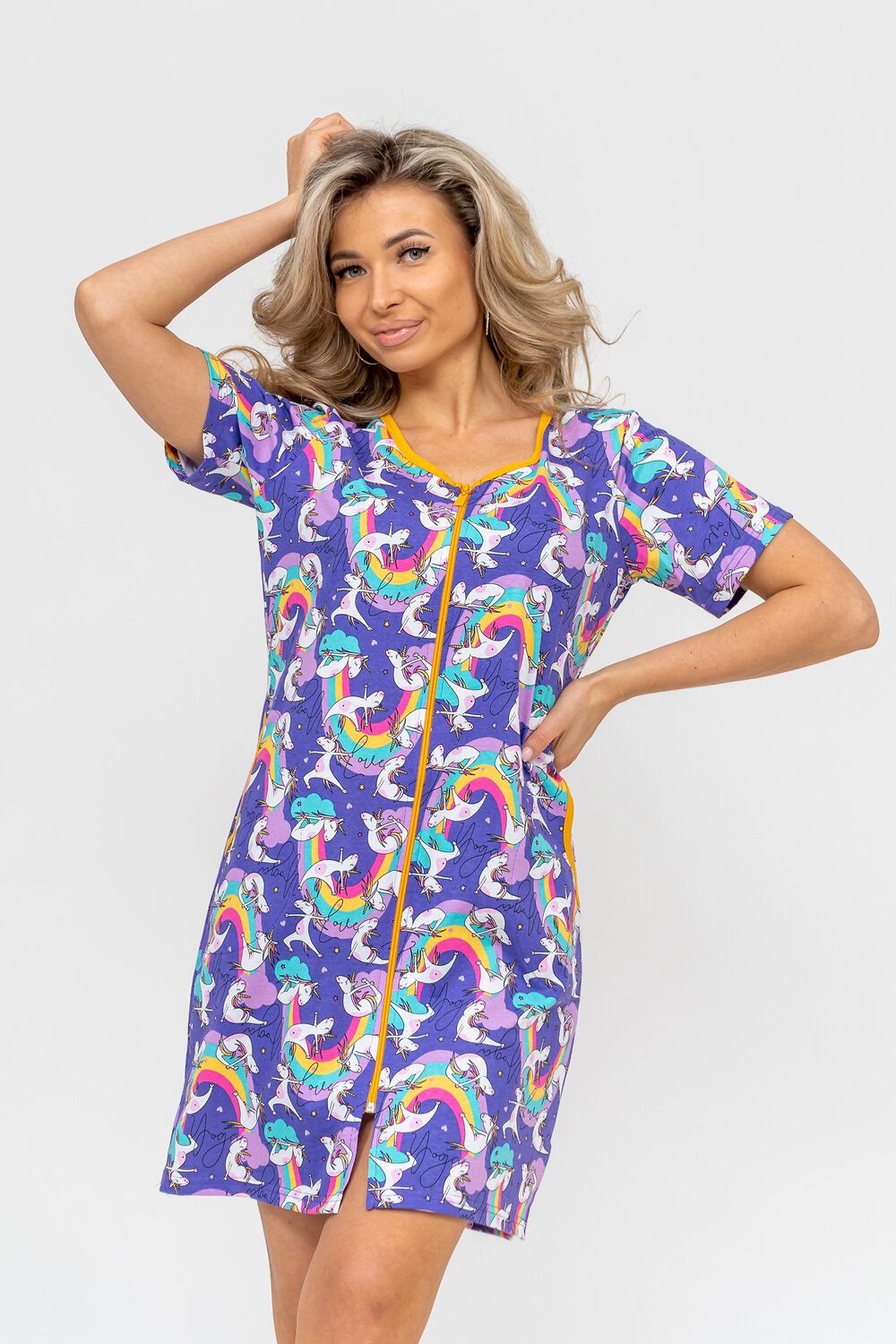 Женский халатик модных трендовых расцветок выполнен из 100% хлопчатобумажной ткани, что обеспечивает максимальный комфорт при ношении. Отличается мягкостью и приятной на ощупь текстурой. Материал прекрасно дышит. Носить такой халатик Вы сможете как летом, так и в любой другой сезон. Надёжный замок на молнии сохраняет свои свойства в течении всего времени использования. Женственный вырез и 2 боковых кармана добавляют образу шарм и делают изделие удобным и практичным. Изысканный, средней длины халатик подойдёт для любого типа фигуры. Отличная модель для дома, для роддома, после родов, для кухонных дел и хозяйственной уборки, для дачи. И конечно идеально после душа, сауны, бани и ванной. А так же будет замечательным подарком на любой праздник: 14 февраля, день рождения, 8 марта. Рекомендуется стирать в деликатном режиме 30 С. Это поможет избежать деформации и сохранить яркость цвета.